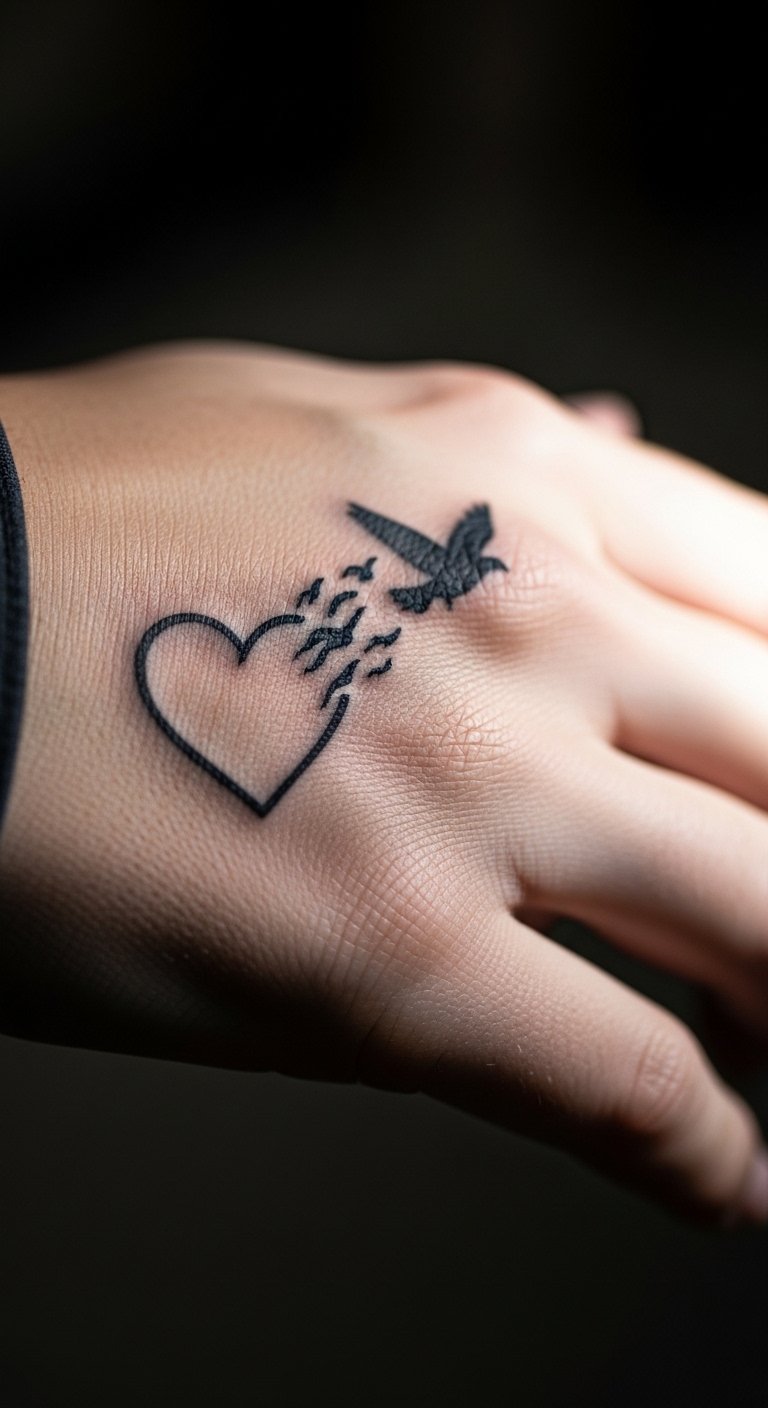A bird heart on your hand symbolizes freedom and soaring love. Birds escape from the heart. Draw birds. Fakes freeing. Back of hand. About $70. Keep flying. Use salve. Craft birds as DIY. It inspires flight.
