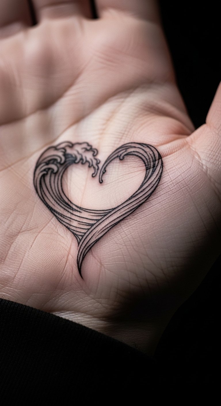 A wave heart on your hand flows with emotion and adventure. Waves surround for movement. Plan waves. Temporaries wavy. Palm spot. $60 cost. Size fluid. Care simply. Ripple water as DIY. It represents journey.