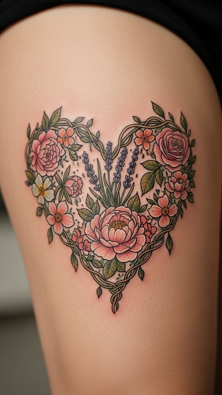 Floral hearts bloom on skin. The thigh offers space for details. This design grows with you. Fees around $130. Press flowers for templates. Do it yourself. The tattoo mixes nature and love. Choose vibrant petals. Moisturize often. Wear loose shorts. This symbol flourishes over time. Personalize with leaves. Visit garden-inspired shops. It feels alive.