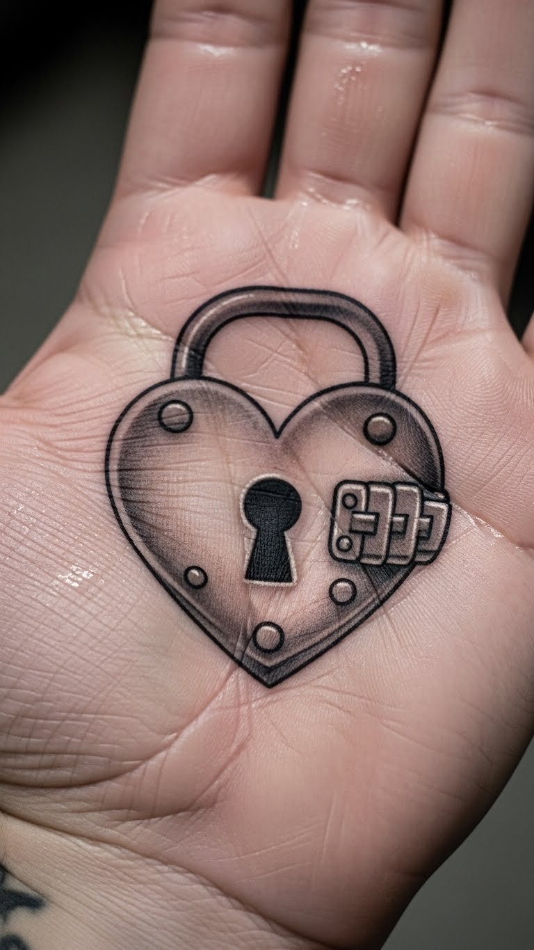Locked hearts keep secrets. The palm is interactive. This design locks feelings. Expect $60. Draw locks on hands. Use markers. The tattoo secures memories. Go for simple keys. Wash hands often. Avoid gripping hard. This symbol protects. Include chains. Palm artists are skilled. It feels personal.