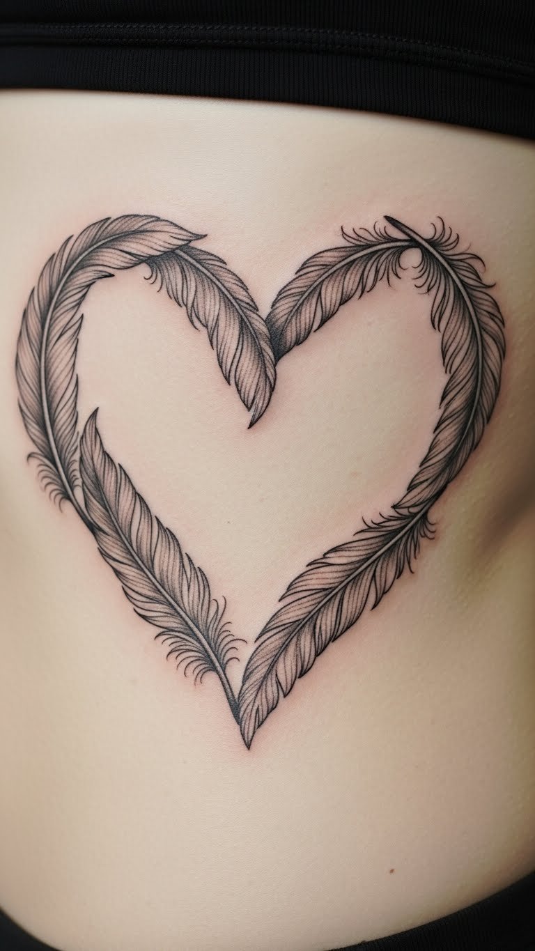 Feathered hearts soar high. The side ribs it nicely. This design floats gently. Budget $110. Draw feathers on cloth. Do casually. The tattoo drifts like air. Go for detailed plumes. Breathe easy during healing. Use side pillows. This piece lifts spirits. Add birds. Rib experts know best. It feels freeing.