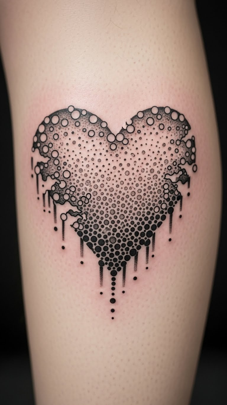 Dotwork eroded hearts build emotion point by point. Think dots as steps to healing. Draw dots with a fine-tip pen at home. Artists might charge $140 for this. Use erasers to simulate on skin. Place on calves for mobility. Keep it detailed yet simple. It grows on you over time.