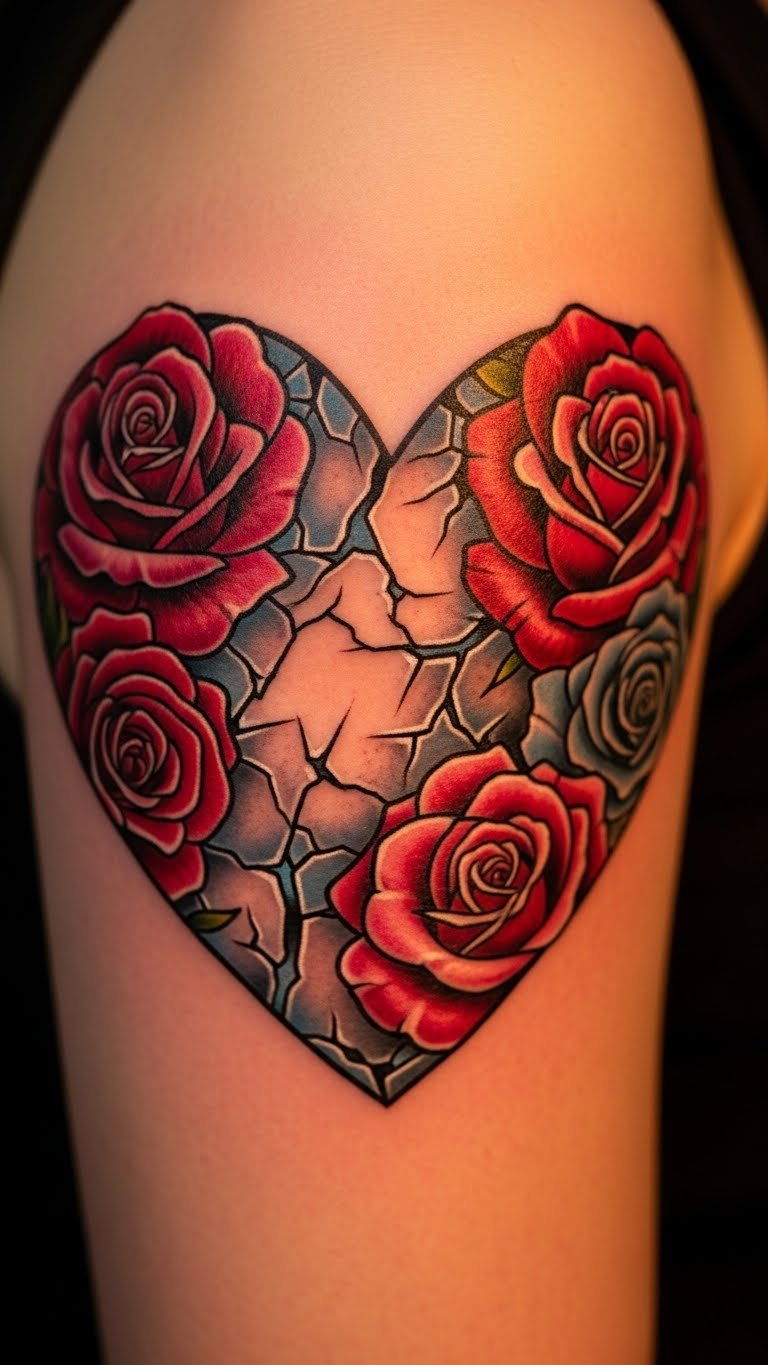 Neo-traditional cracked roses with hearts blend old and new pain. See roses as blooming resilience. Sketch roses simply with colored pencils. Find artists for $220. Photo your arm for checks. Put it on upper arms for strength. Mix elements wisely. This design blooms with meaning.
