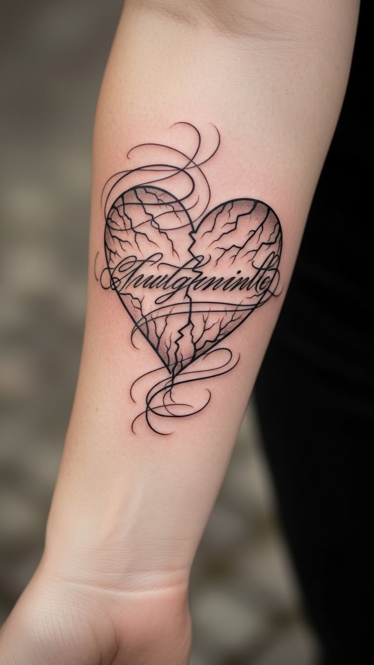 Scripted hearts with cracks weave words into wounds. It’s your phrase etched in. Write scripts on paper freely. Find scripters for $110. Test with temporary tattoos. Add to forearms for visibility. Choose short phrases. This personalizes deeply.