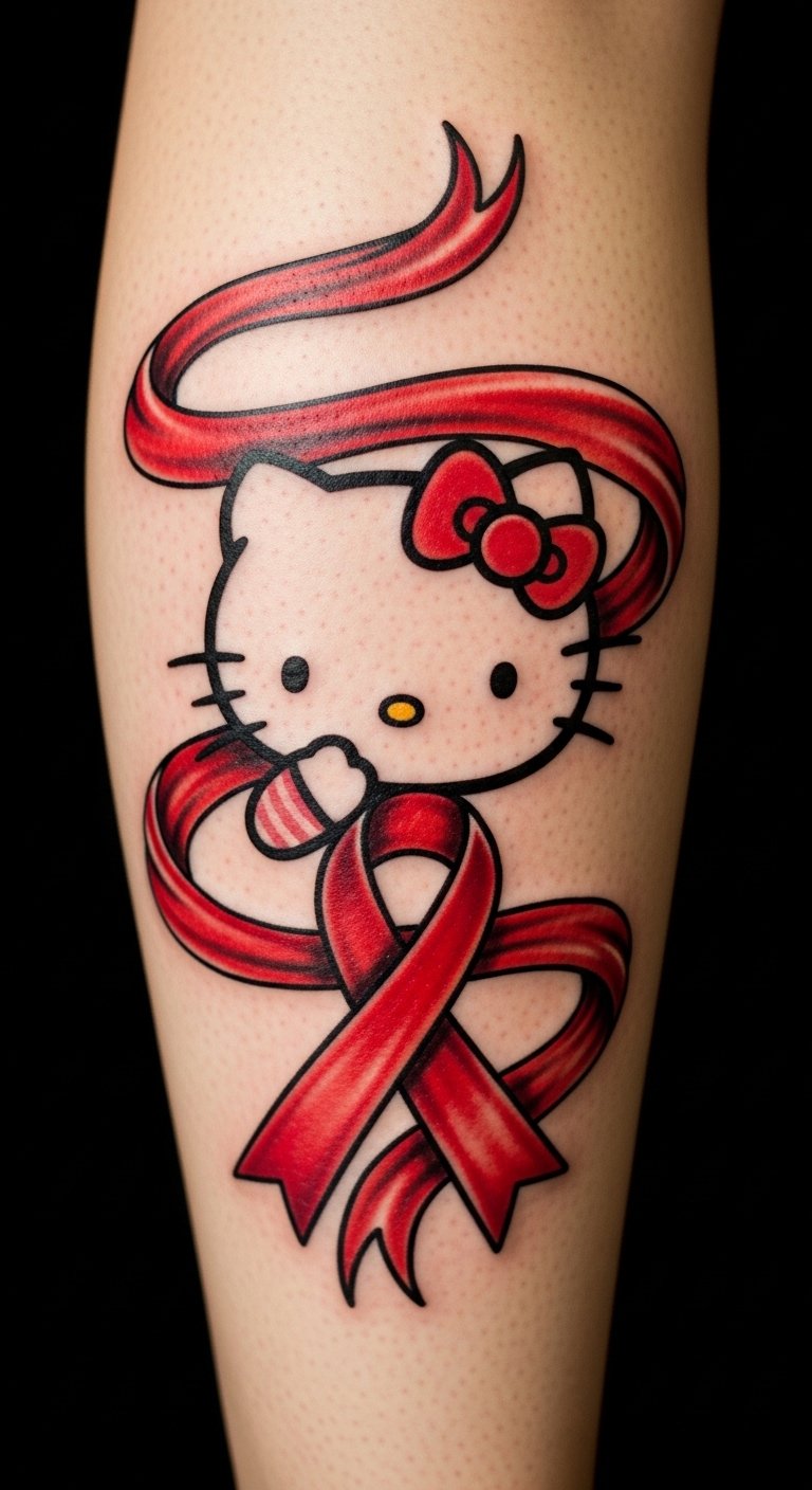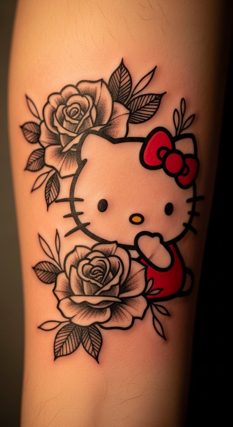 Add nature’s touch for a tattoo that blooms with personality. Hello Kitty with flowers pairs the character with roses or daisies around her face. Put it on your forearm to show it off daily. Sketch ideas on a notebook using colored pencils to plan the layout—it’s a quick way to experiment. Look for affordable artists at conventions; you might snag one for $80. Try a henna version at home with store-bought cones for a temporary option that lasts two weeks. Include a favorite flower to make it unique. Care is simple—clean with soap you already have and cover it from the sun. This design brings a fresh, lively feel without breaking the bank.