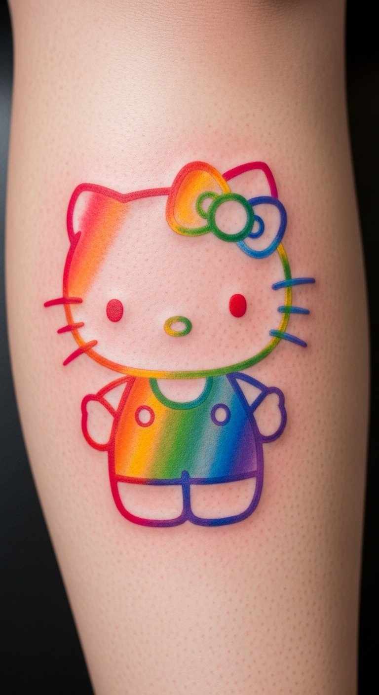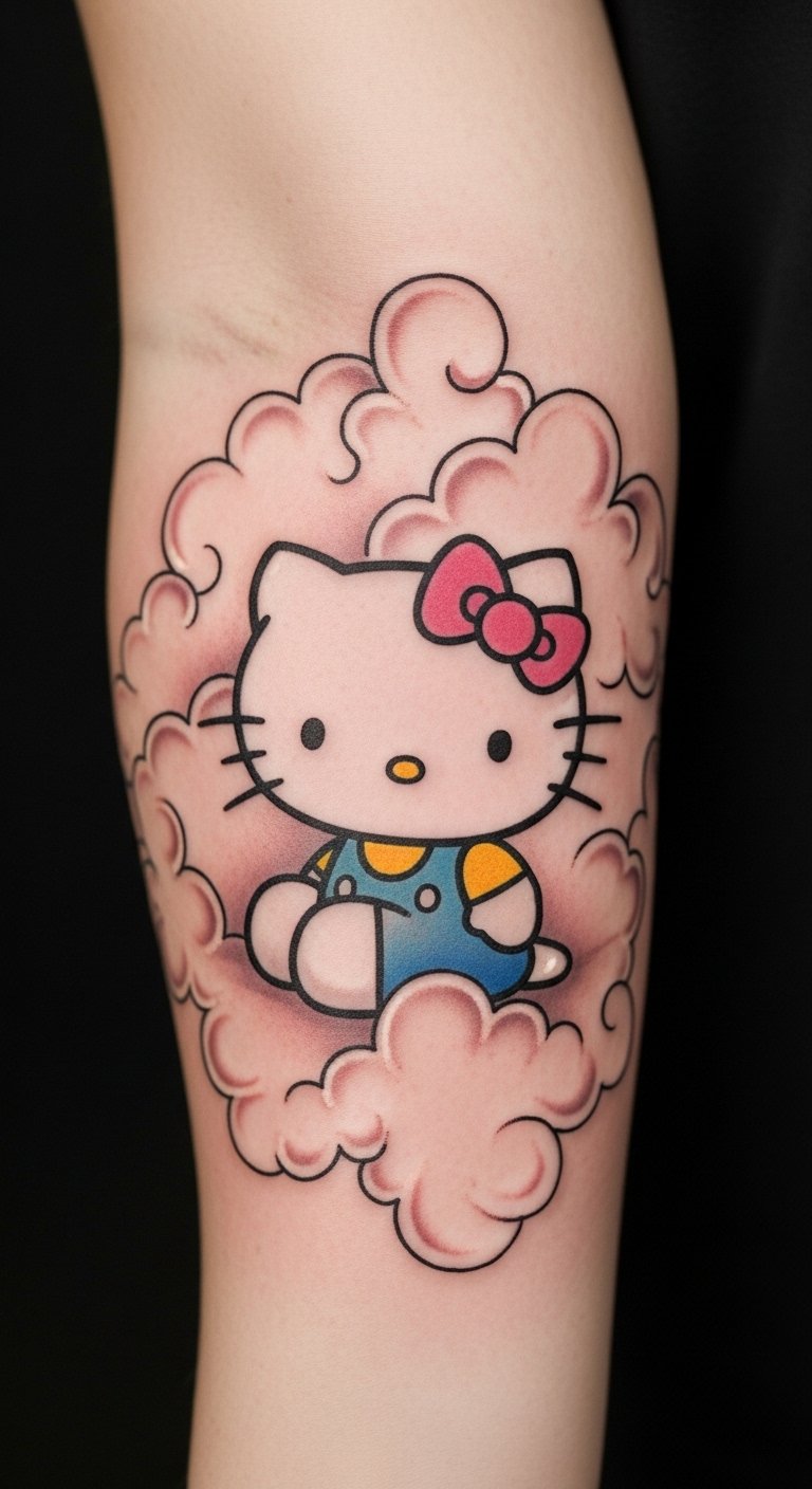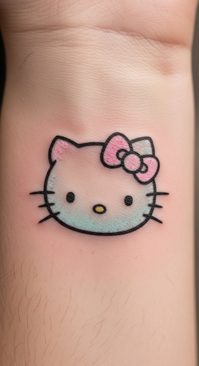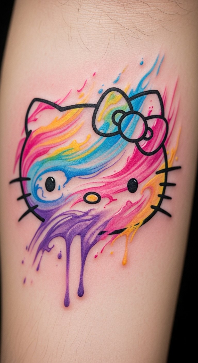 Go for soft, blended colors to make your tattoo pop with whimsy. A watercolor Hello Kitty uses gentle shades of pink and blue for a painted look that feels artistic. Place it on your shoulder for easy visibility. Draw inspiration from YouTube tutorials; grab markers and paper to practice blending techniques at home. Save money by choosing a new artist who offers deals—some charge $100 or less for smaller pieces. For a DIY feel, use washable paints on your arm to preview the design before going pro. Mix in elements like small hearts for a custom touch. After getting it, protect the area with sunscreen from your cabinet to keep colors bright. This style turns your skin into a canvas that’s fun and affordable to maintain.