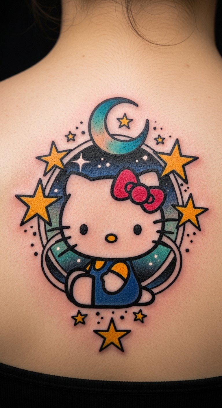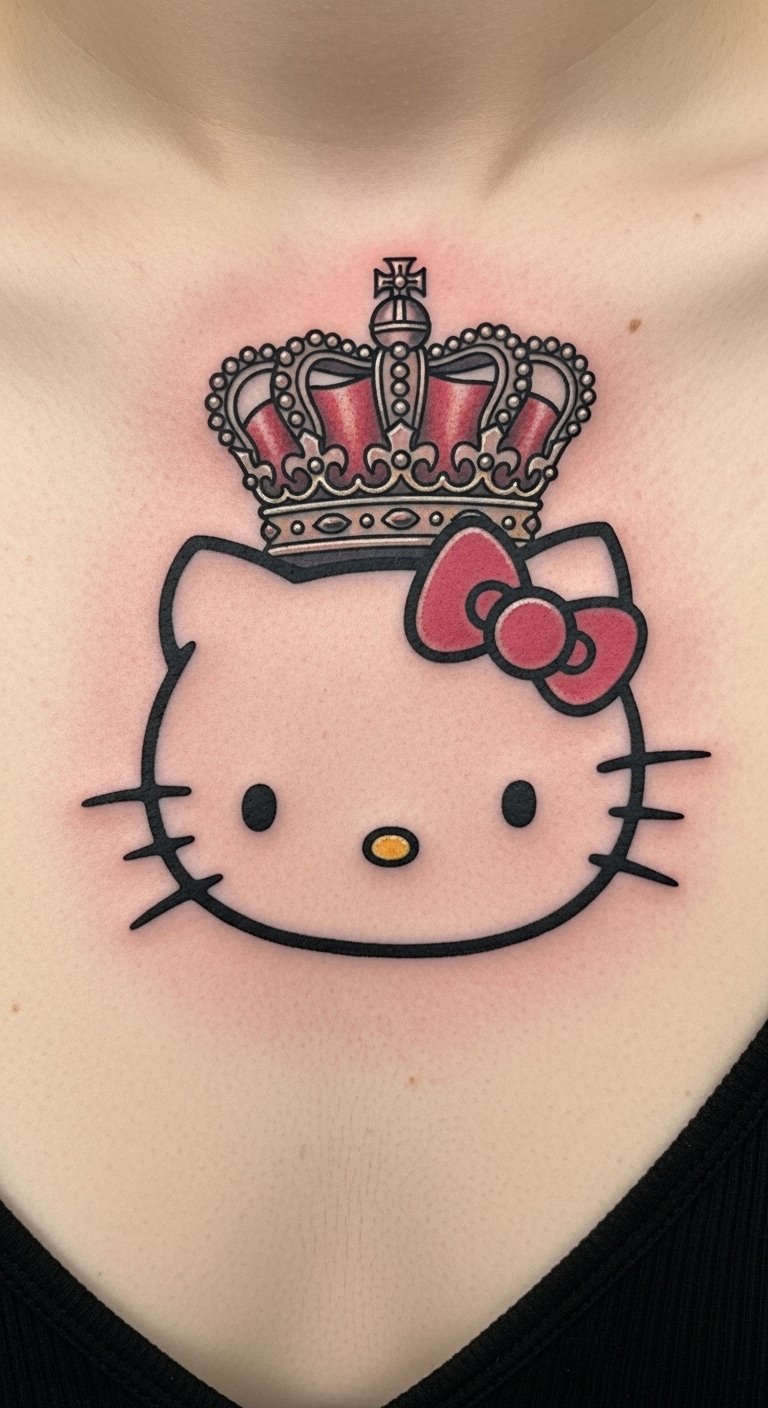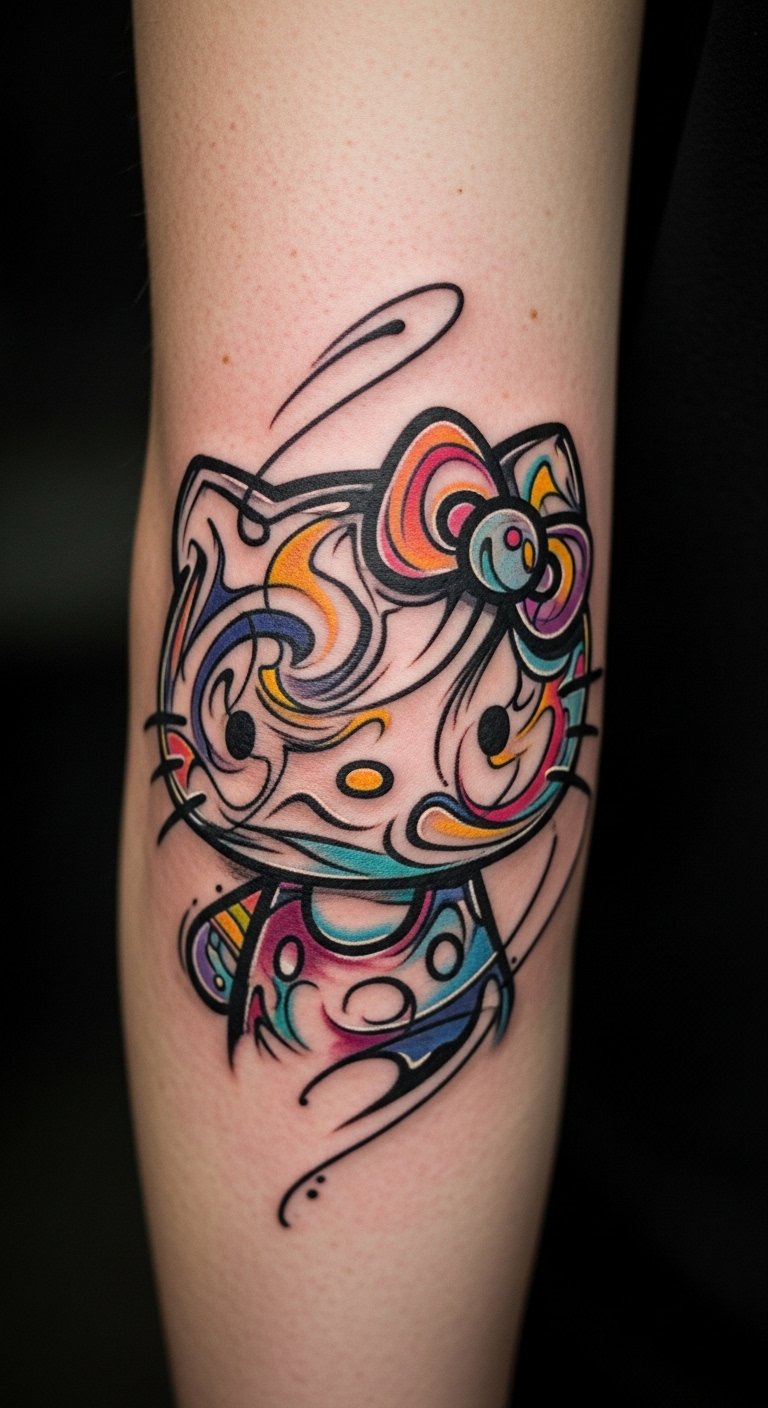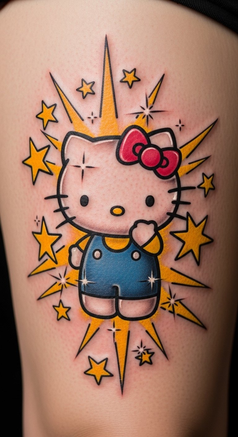 Mix old-school vibes with modern flair for a standout tattoo. Neo-traditional Hello Kitty amps up the lines and adds shading for a bold effect. Spot it on your upper arm for a cool reveal. Practice on paper with bold markers to nail the style at no cost. Find deals online from artists starting at $150 for smaller work. For fun, use sticker sets to mimic the look temporarily. Throw in elements like waves for your twist. Keep it fresh with daily moisturizer from your shelf. This option gives your tattoo character without much effort or expense.