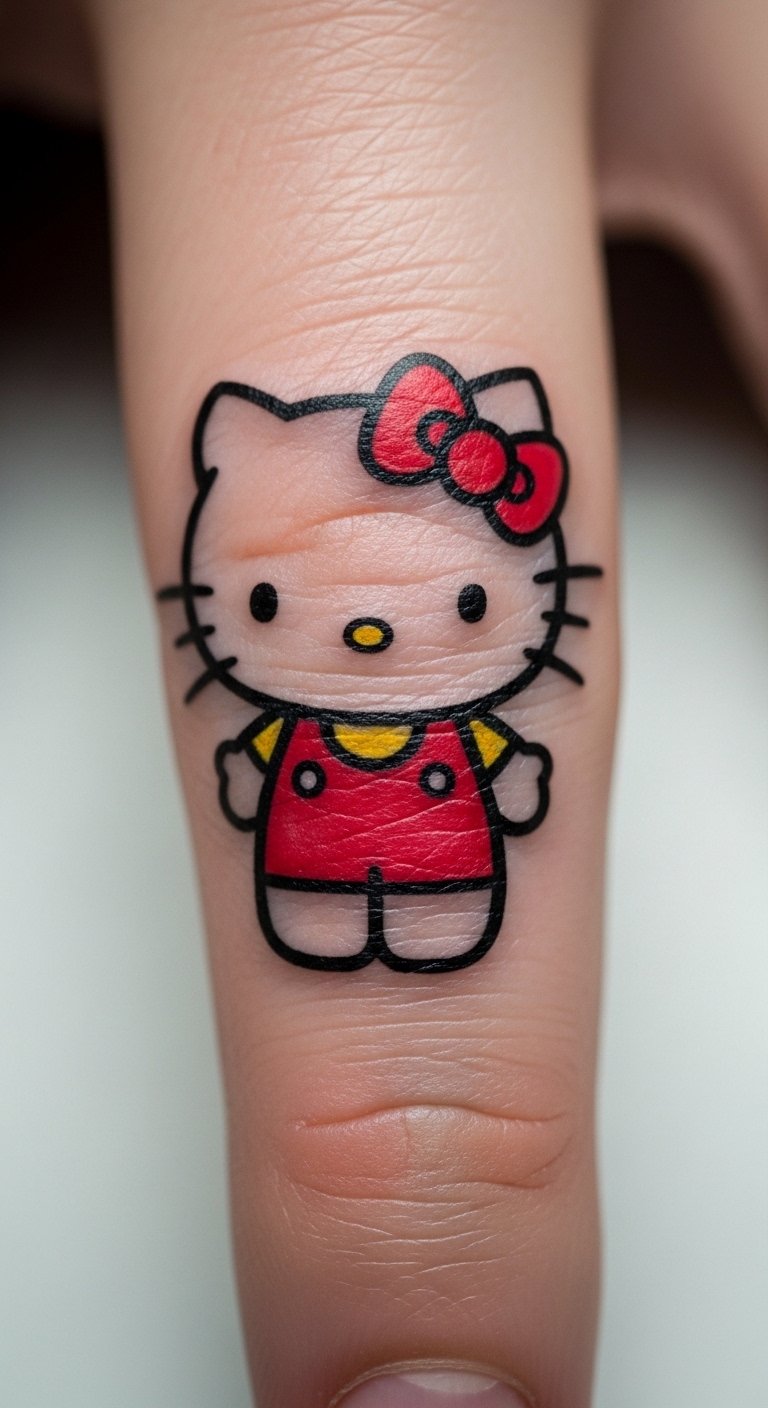 Highlight the bow for icon status. Hello Kitty bow focus centers on that red element. Put it on your finger for subtlety. Sketch bows on cards. Find finger tattoos for $30. Use ring stickers to test. Add a pattern inside. Care with gloves. This makes a statement simply.
