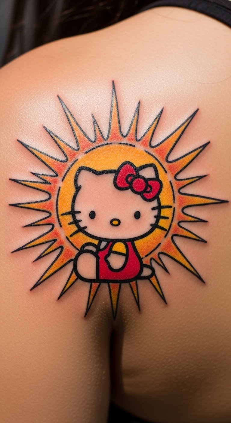 Brighten with sun rays. Hello Kitty and sun surrounds with beams. Shoulder blade for strength. Sketch suns quickly. Find for $100. Try sun transfers. Add your ray style. Protect from elements. This design warms up.