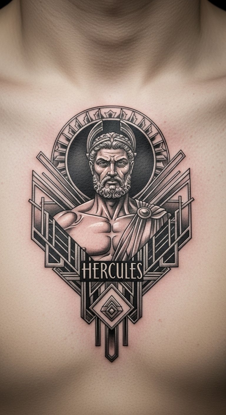 Sleek lines and symmetry define this Art Deco look. See Hercules with geometric shapes, adding elegance to the myth. It’s great for a modern edge. Practice drawing straight lines with a ruler at home—no fancy tools needed. Prices start at $80 for simple versions. Choose your chest for a bold statement. Incorporate patterns from your jewelry for personalization. Keep appointments short to manage time and budget. Use free online tools to mock it up. This helps you decide quickly. Turn it into an affordable way to express style.
