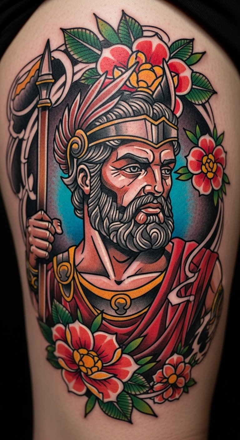 Bold colors and flowers enhance this Neo-Traditional style. Hercules gains floral backgrounds, blending toughness with beauty. It’s ideal for nature-inspired folks. Draw flowers around a basic figure using crayons at home. Prices range $120-250. Place it on your thigh for coverage options. Mix in your favorite blooms for a twist. Break shading into separate visits to cut costs. Practice with colored pencils first. This makes the process straightforward and affordable.