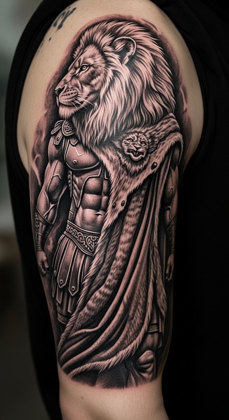 The lion skin adds raw power to Hercules. It’s a nod to his famous feats. Trace a lion shape at home with ease. Prices start at $70. Go for your upper arm to show it off. Customize with colors that match your style. Divide the work into quick sessions. Use tape to outline on your skin first. Make it a simple, empowering addition.