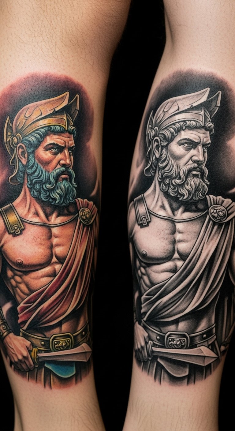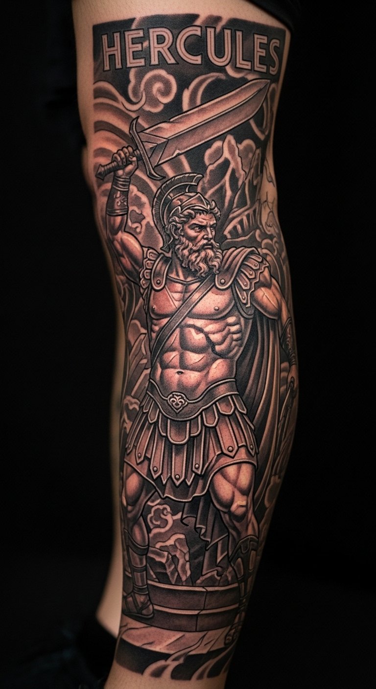 Action-packed scenes show Hercules fighting the Hydra. This design highlights triumph over challenges. Sketch the fight sequence on paper to plan ahead. It won’t cost a dime. Expect $100-300 depending on detail. Put it on your calf for a story that unfolds. Add personal enemies to symbolize your wins. Schedule in phases for better budgeting. Try a simple drawing app on your phone. Keep it real and motivating.
