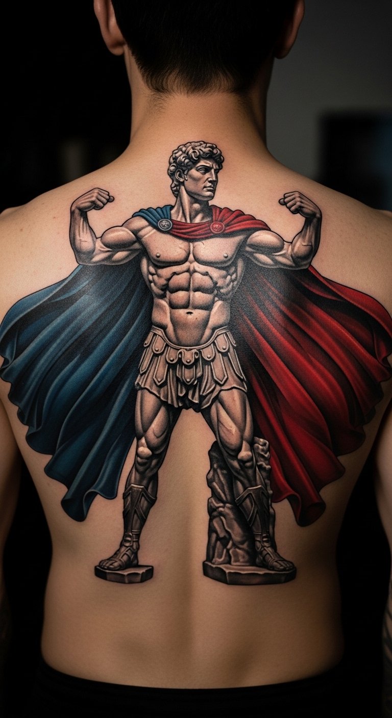 Go big on your back with Hercules stories. It’s for those who want a full tale. Sketch panels at home simply. Expect $150-400. Add chapters of your life to it. Spread sessions out. Use wall drawings for planning. Turn it into an epic, budget-friendly story.