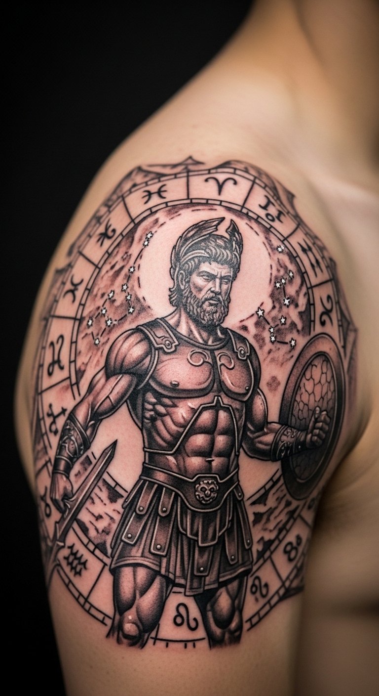 Stars and myths mix in this cosmic twist. Imagine Hercules surrounded by galaxies, showing endless adventure. This design appeals if you love space vibes. Use a free app to overlay star patterns on your phone photo before committing. It helps visualize without extra cost. Artists charge $150-300 for medium sizes. Place it on your back for a big impact. Add your birth constellation for a personal spin. Short sessions keep it affordable. Draw a rough version at home with markers. Simple actions like this prepare you for the real deal. Get a design that reflects your journey through the stars.