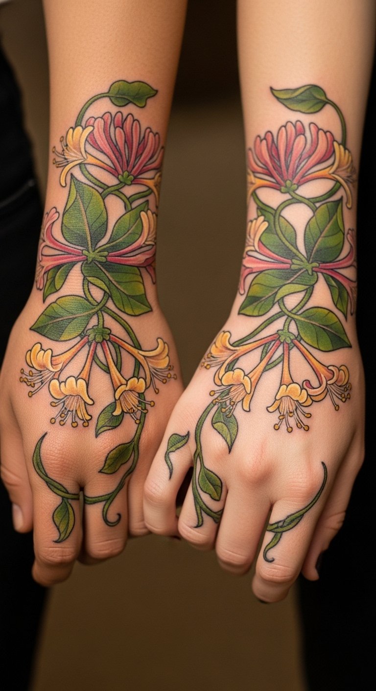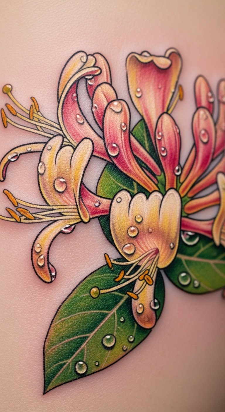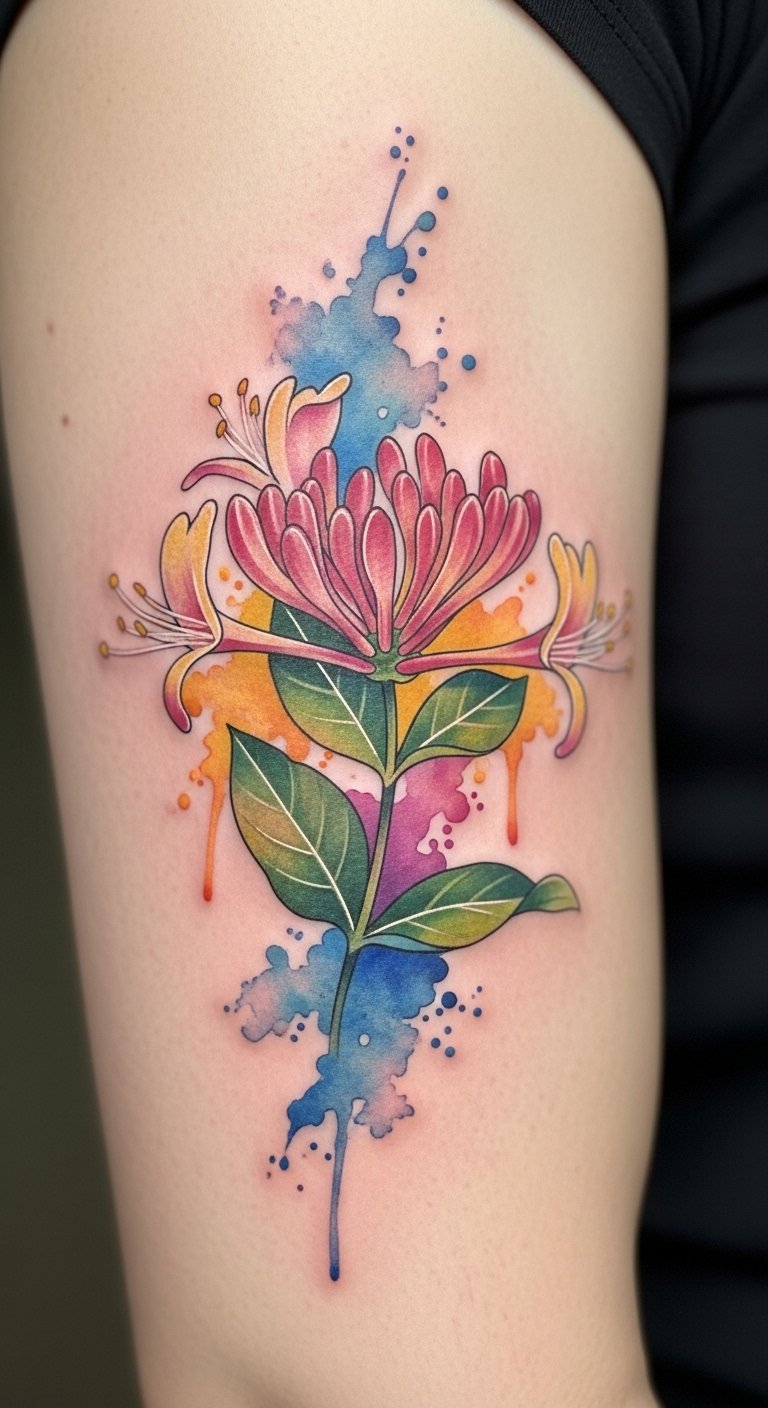 Watercolor looks artistic. Colors blend smoothly. Use water-based paints for trials. Bold this: watercolor honeysuckle. Free apps help visualize. Place it on your rib. Watch for artist discounts. It adds flair. Keep blends light. Pair with washes. This idea flows. Experiment at home. Paint on paper. Make it creative.