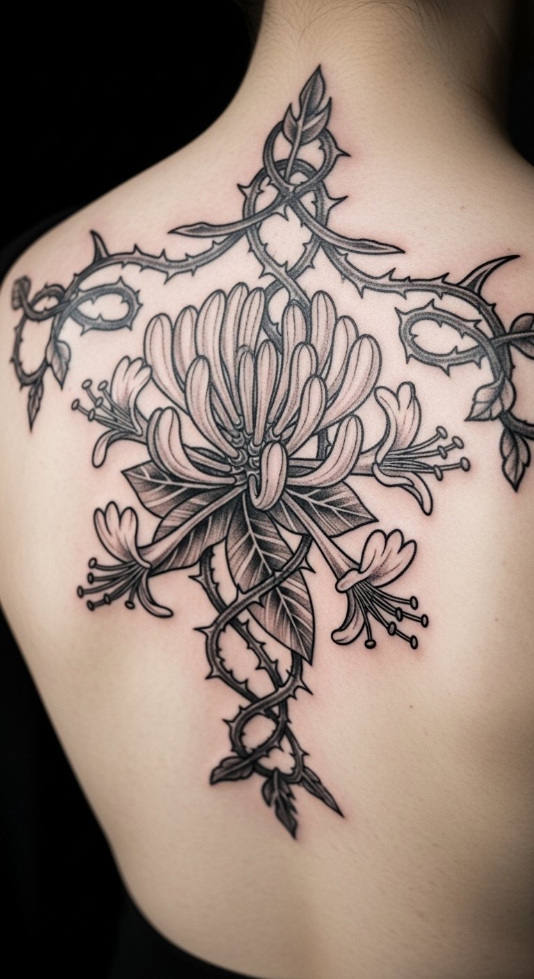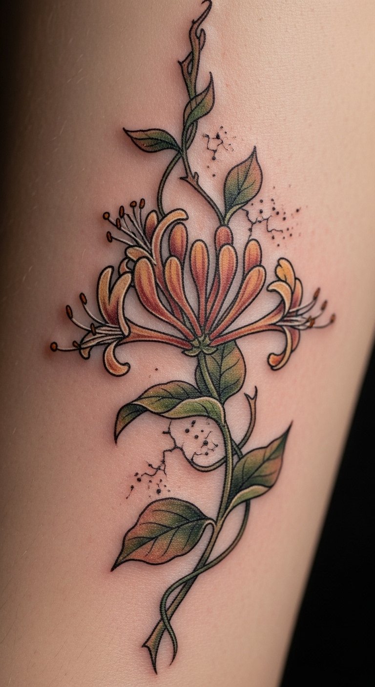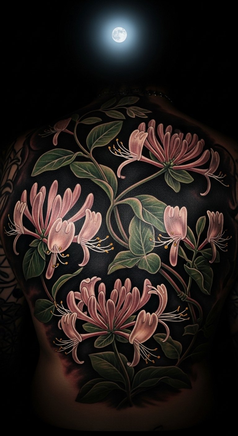 Night scenes intrigue. Add moons and stars. Draw under a lamp. Bold this: nighttime honeysuckle. Use glow stickers. Place on back. Seek night-themed ink. It mystifies. Keep shadows soft. Pair with creatures. This design glows. Sketch in dim light. Creative twist. Make it moody.