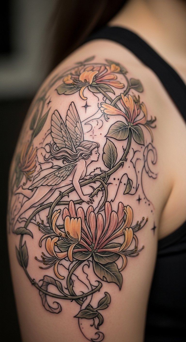 Nymphs add fantasy. Blend myths into the flowers. Use simple drawings to plan. Bold key: honeysuckle with nymphs. Test with ink pens at home. Place it on your thigh for impact. Check for sales at tattoo expos. It sparks imagination. Keep figures minimal. Pair with vines. This idea tells stories. Draw it on napkins. Quick and cheap. Make it magical.