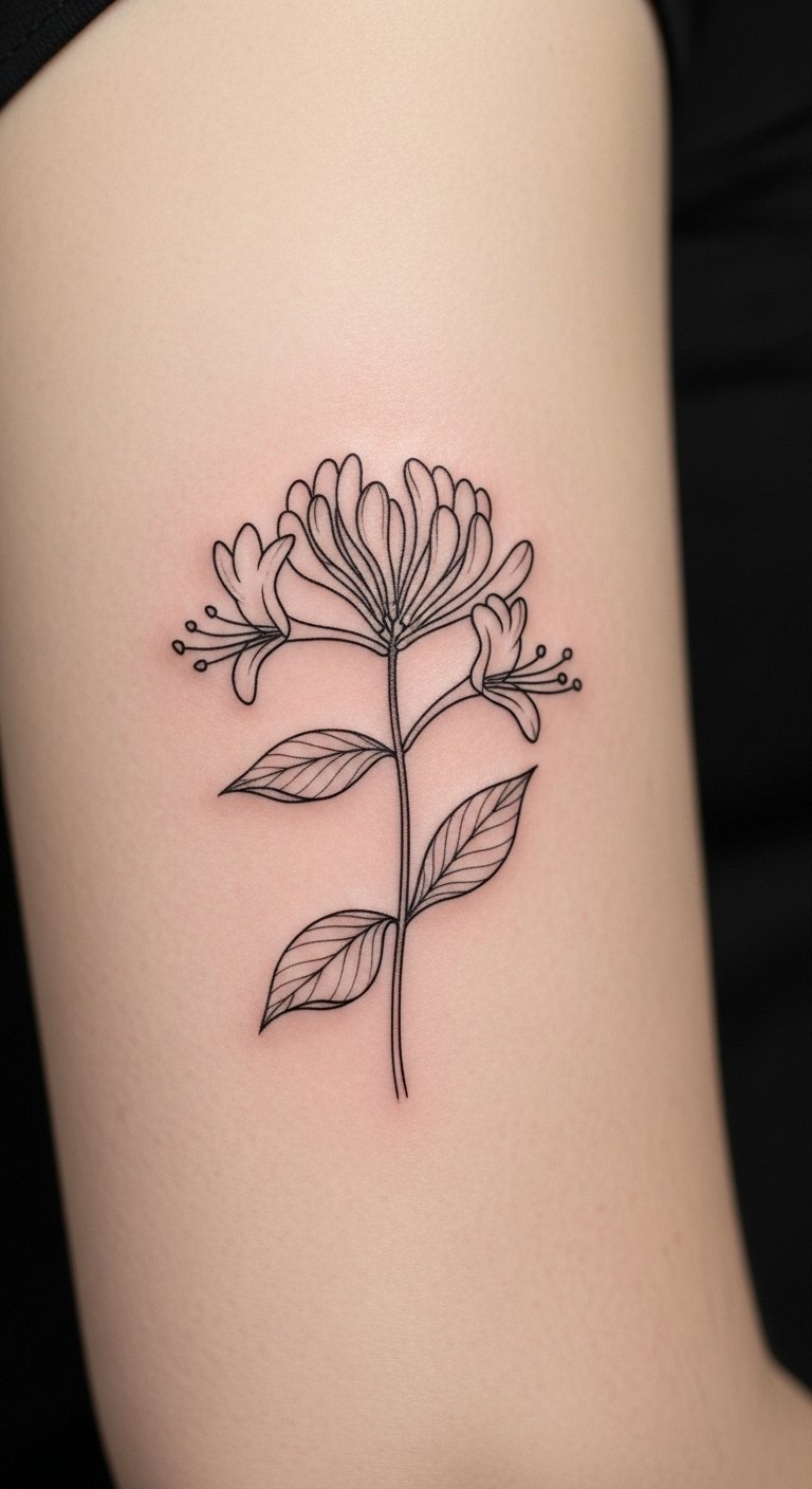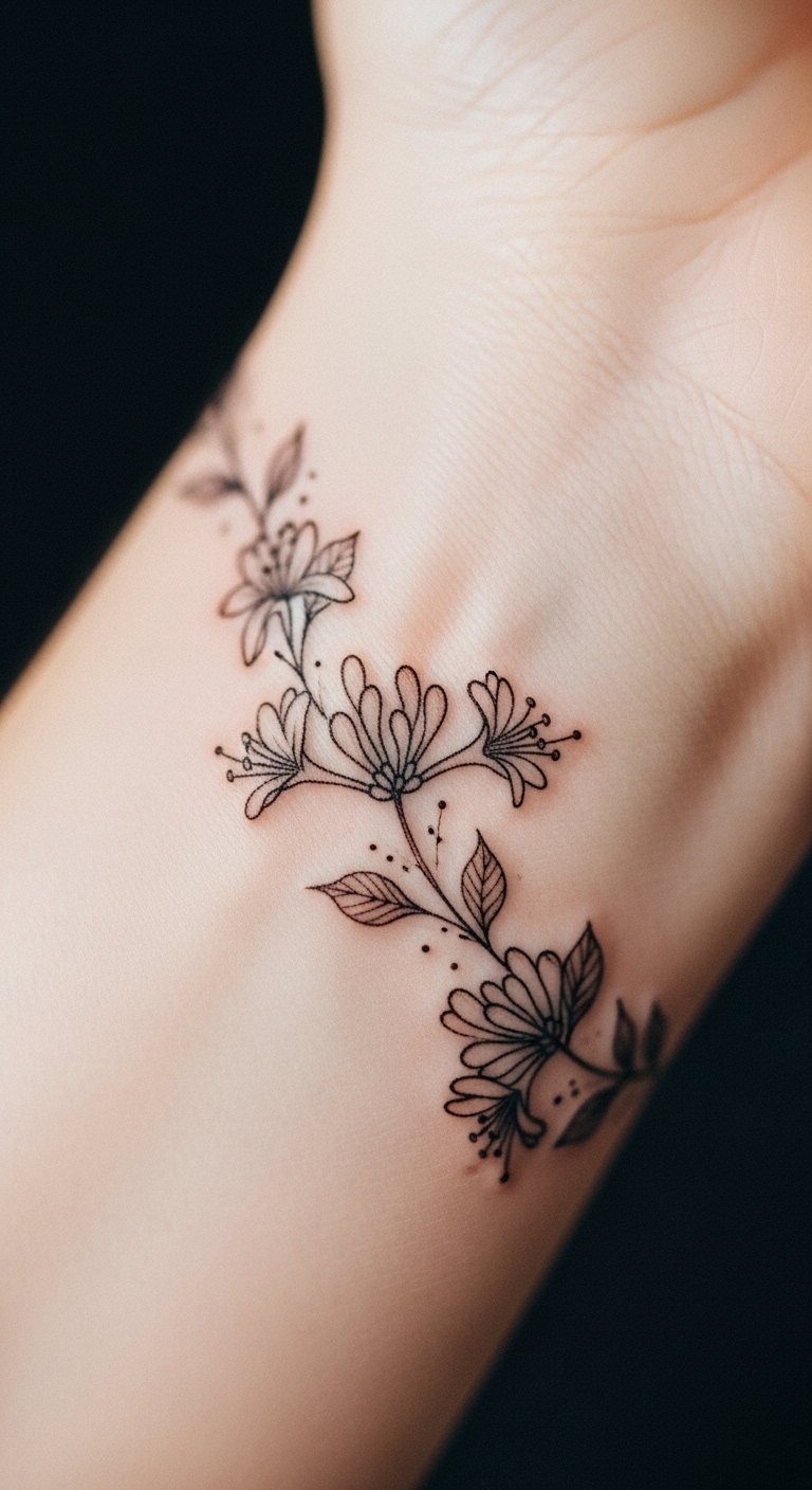 Less is more here. Just outlines shine. Draw with a pencil first. Bold key: minimalist honeysuckle. Use tracing paper for practice. Place it on your wrist. Find flash deals online. It stays subtle. Add tiny details. This idea fits everyone. Sketch on your hand. Free and easy. Make it elegant.