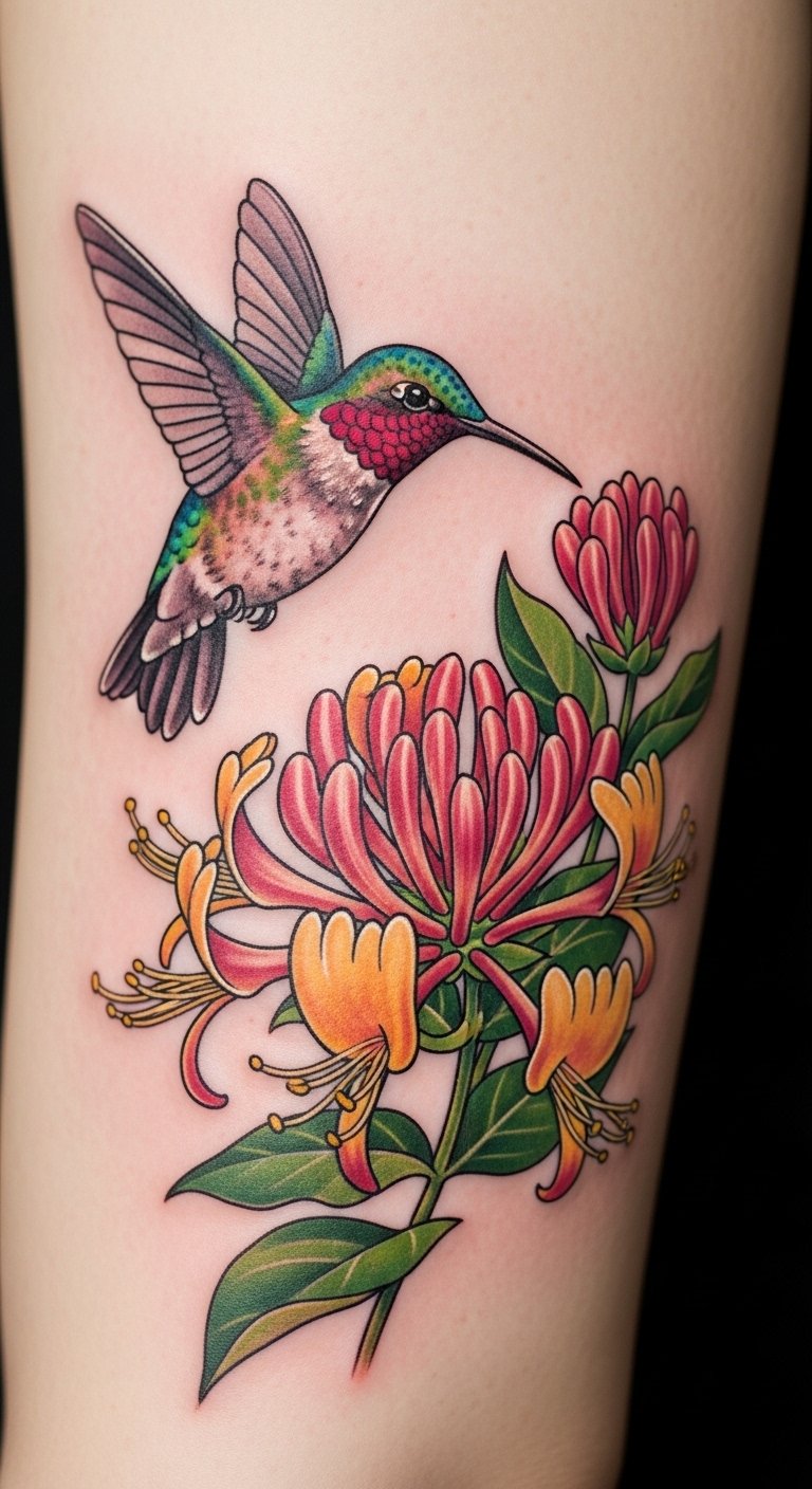 Hummingbirds energize it. They hover near blooms. Plan with basic drawings. Bold this: honeysuckle with hummingbirds. Test on fabric scraps. Place it on your forearm. Seek combo specials. It feels alive. Keep the bird small. Blend with flowers. This design thrills. Draw it freehand. Simple start. Make it dynamic.