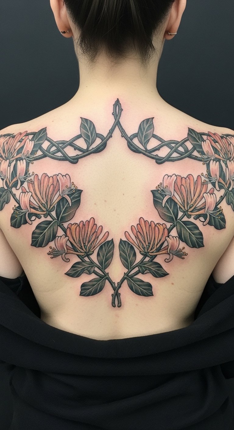 The back offers space. Vines spread wide. Map it on a mirror. Bold this: honeysuckle back placement. Use body markers for tests. Place centrally for balance. Look for session packages. It makes a statement. Keep it symmetrical. Add elements carefully. This design impresses. Trace on yourself. Easy prep. Make it bold.