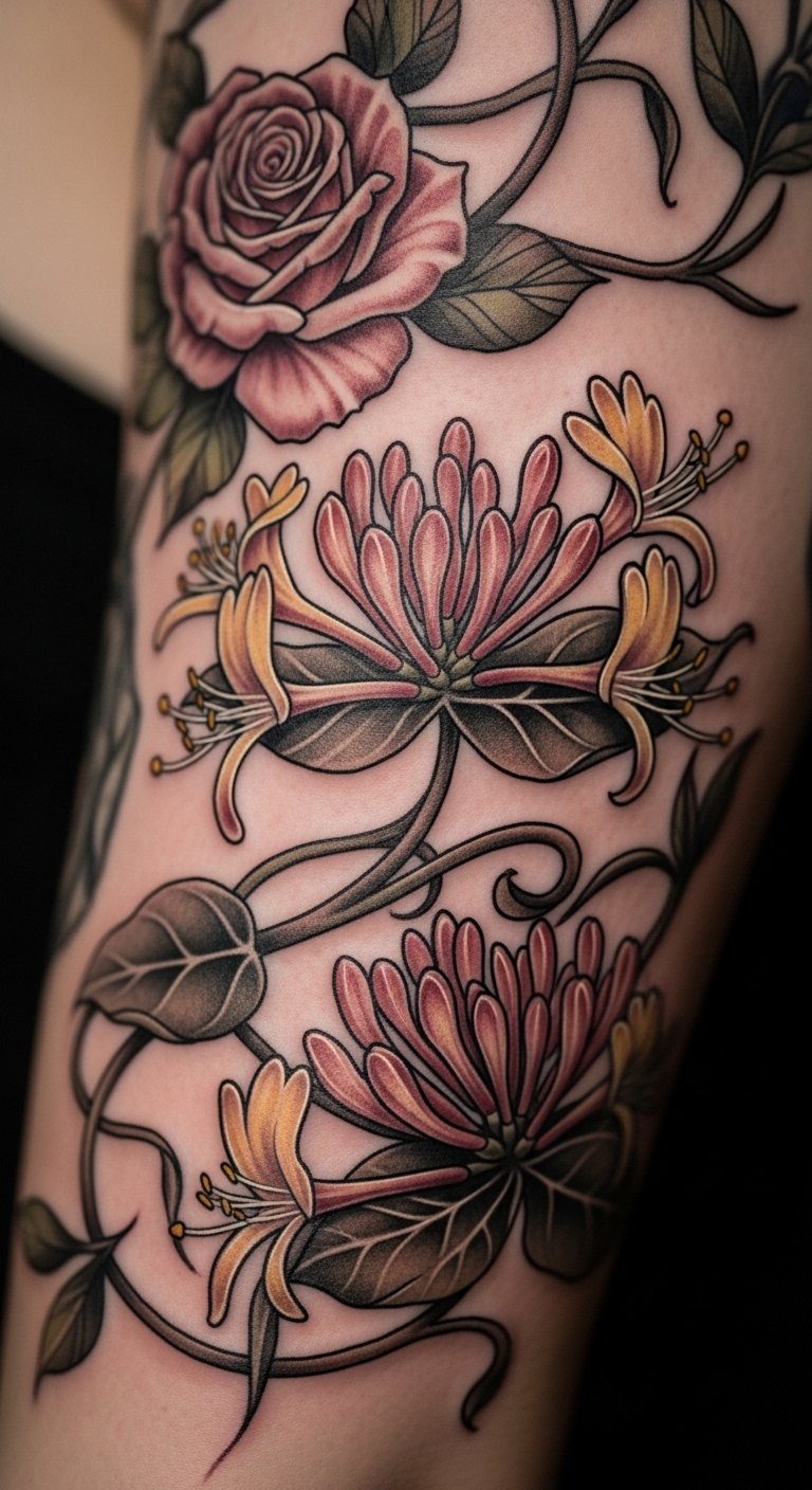 Roses add romance. Twine them together. Sketch combos easily. Bold this: honeysuckle with roses. Use flower stencils. Place on arm. Look for bundle deals. It deepens meaning. Keep them balanced. Merge petals. This idea blooms. Arrange on paper. Crafty fun. Make it lush.