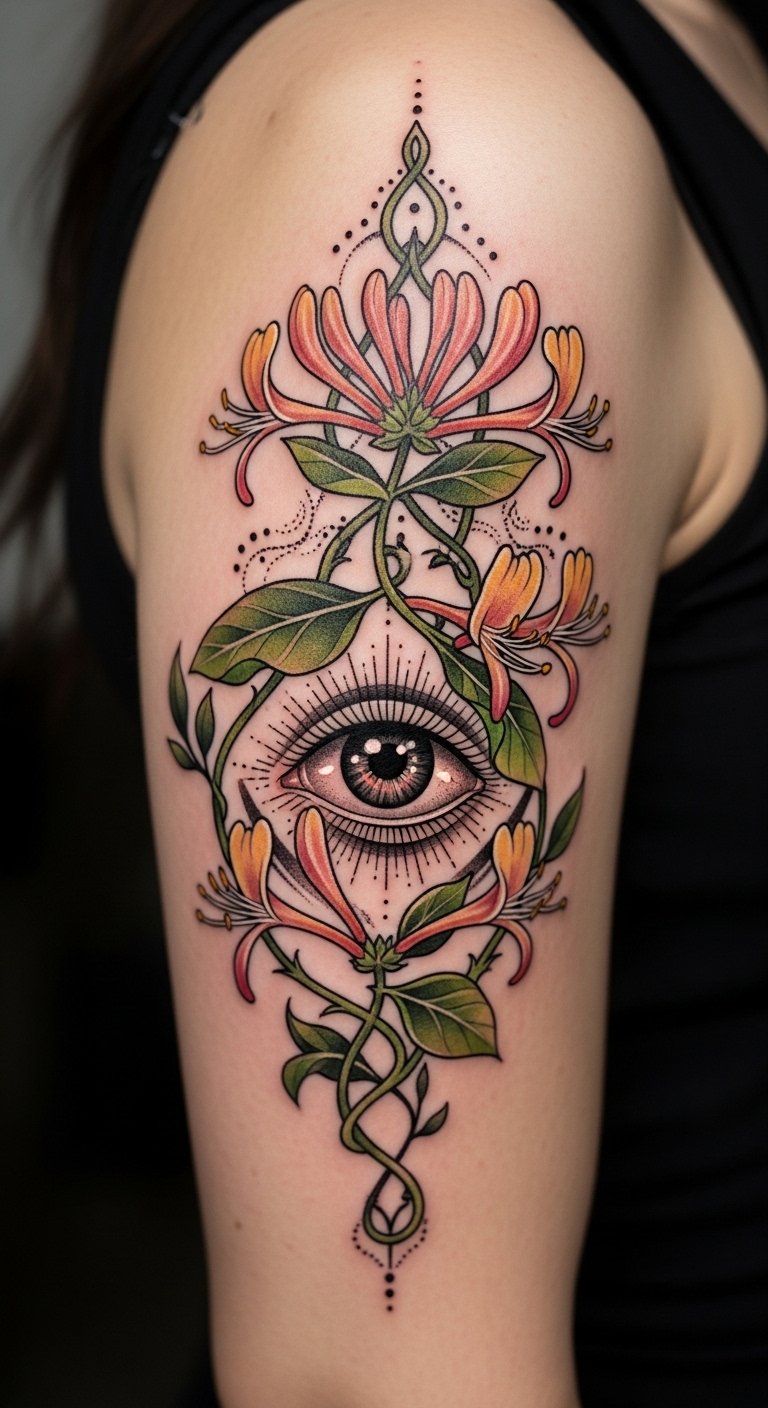 Honeysuckle wards off negativity. Make it your shield. Start with a basic outline on paper. Add protective symbols like shields. Bold this: honeysuckle for protection. Use affordable stencils for home trials. Place it on your back for a hidden spot. Look for budget artists online. It brings peace without hassle. Keep the design straightforward. Combine with simple lines. This tattoo fits spiritual vibes. Draw it freehand at home. Save money and time. Make it a personal ritual.