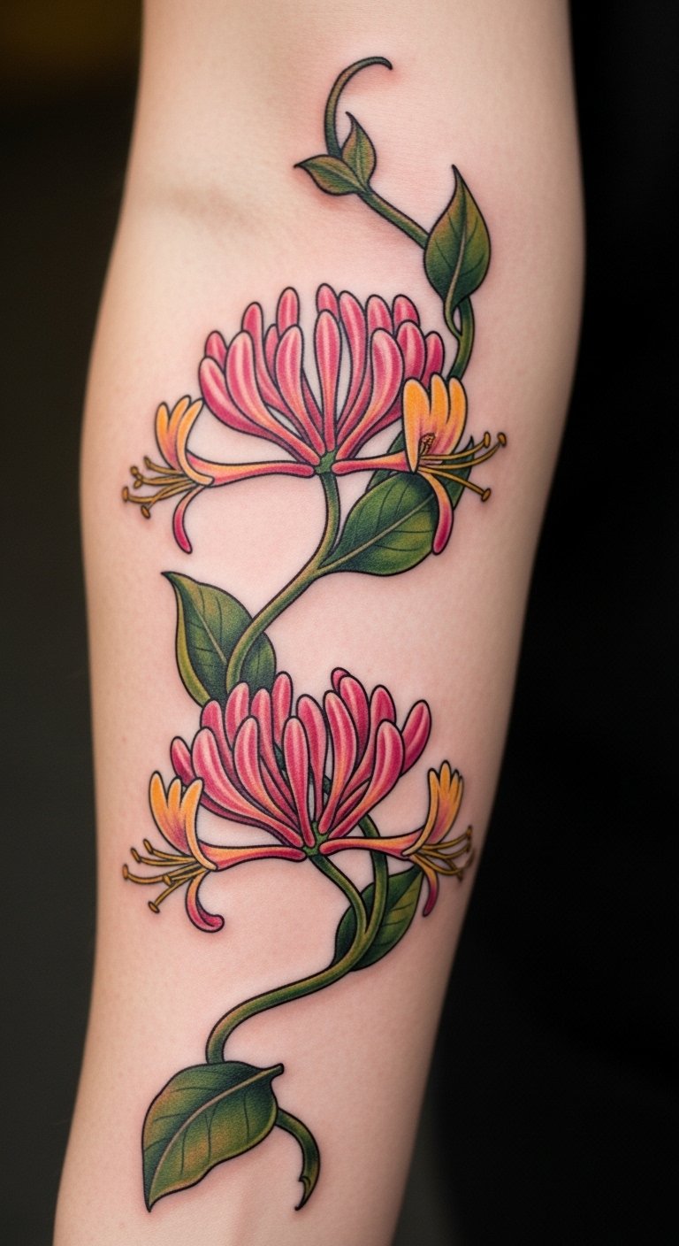 Pink brings sweetness. Choose soft shades. Color in sketches with markers. Bold this: pink honeysuckle design. Use phone apps for free edits. Place it on your collarbone. Look for pigment deals. It adds cheer. Keep petals simple. Mix with greens. This design pops. Try watercolor paints at home. Low cost fun. Make it vibrant.