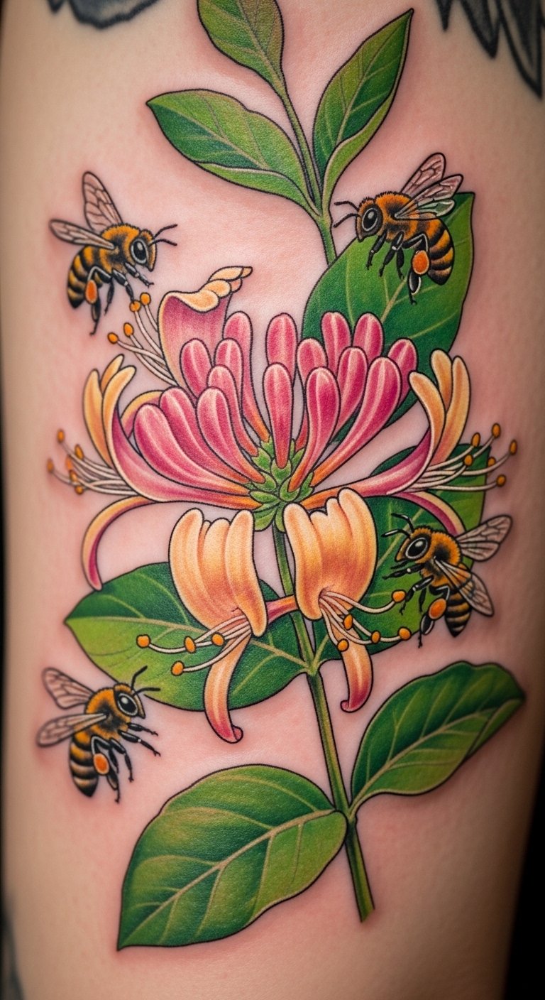 Bees add buzz. They pollinate blooms. Sketch insects quick. Bold this: honeysuckle with bees. Use bee stickers. Place on arm. Seek insect themes. It energizes. Keep bees active. Blend with honey. This idea swarms. Draw bugs simply. Buzzing prep. Make it lively.