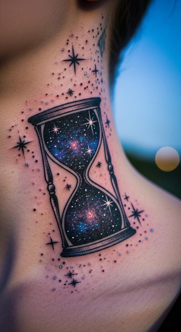 Stars around an hourglass link to the cosmos. It stands for eternal time. Sketch stars with the hourglass on paper. Dot them near the top. Book for $55. Put it on your neck for elegance. Use stencils for stars. Keep it simple for cost. This design shines brightly.