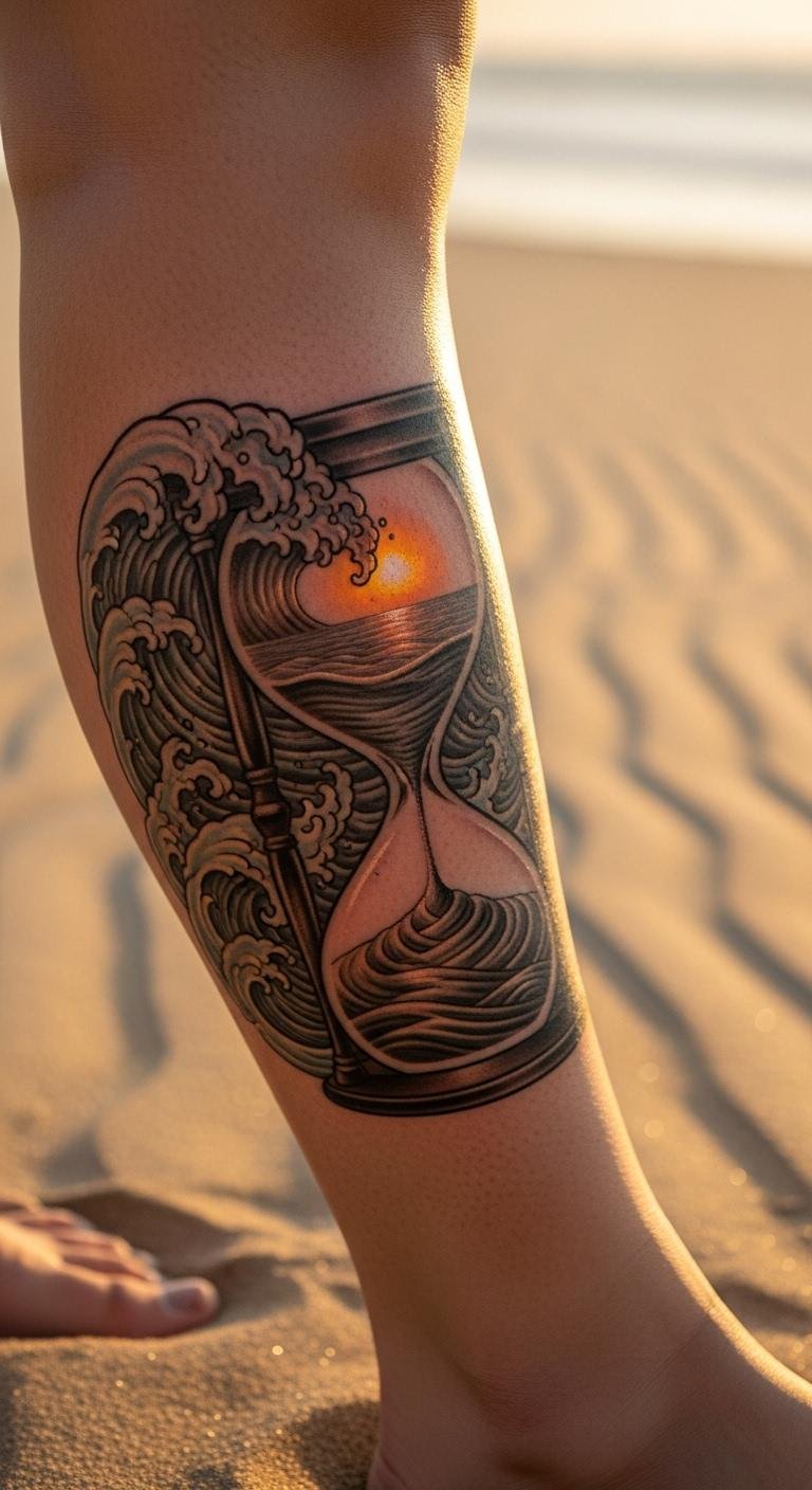 Waves in an hourglass suggest endless flow. It mirrors ocean time. Draw wavy lines through the shape. Add curves for water. Book for $65. Place on your leg dynamically. Beach sketches inspire. Keep waves minimal for savings. This design rolls naturally.