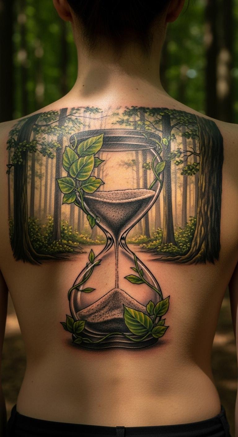 Nature elements around an hourglass connect to earth. It grounds the concept. Draw leaves framing the form. Add branches for detail. Find a spot for $70. Position on your back widely. Nature photos guide you. Keep scenery simple. This scene feels real.