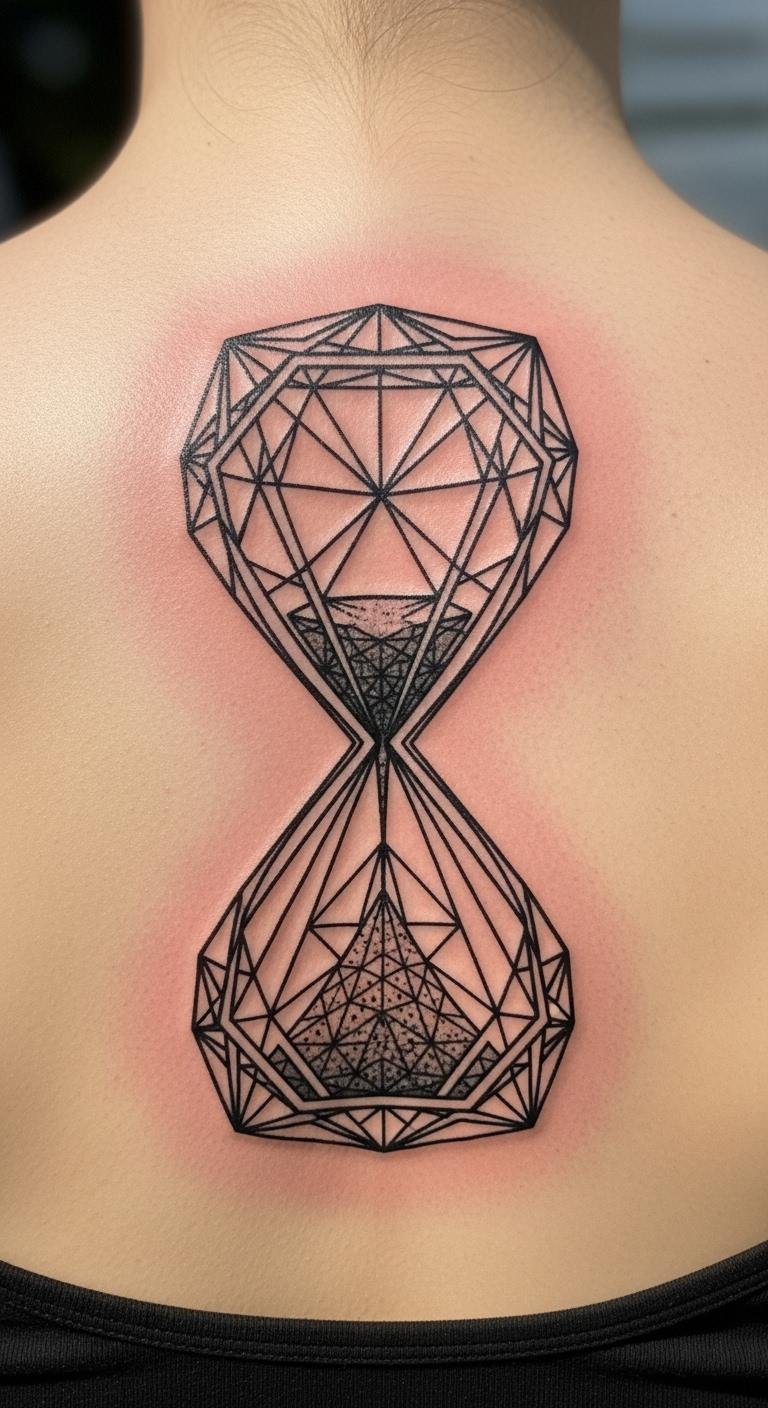 Geometric additions make an hourglass modern. It plays with shapes and time. Draw grids on paper for the design. Add triangles around the bulbs. Get it for $60 at a local spot. Position on your back for symmetry. Try ruler tools for accuracy. Keep geometry basic. This style is fun and precise.
