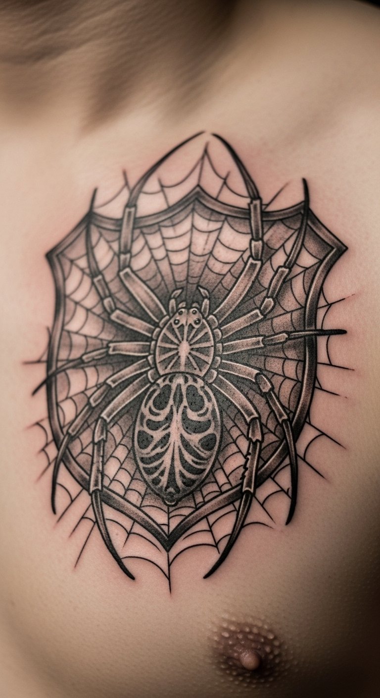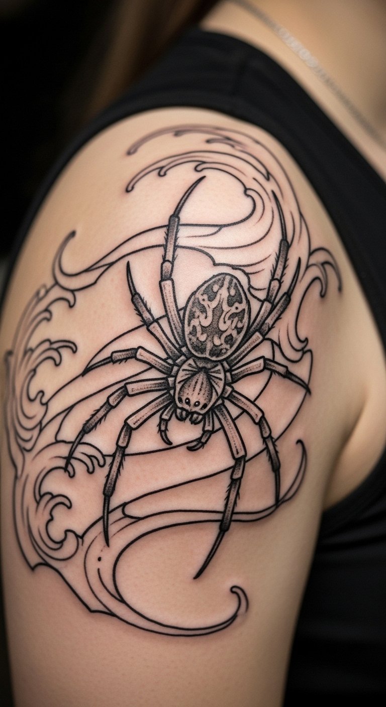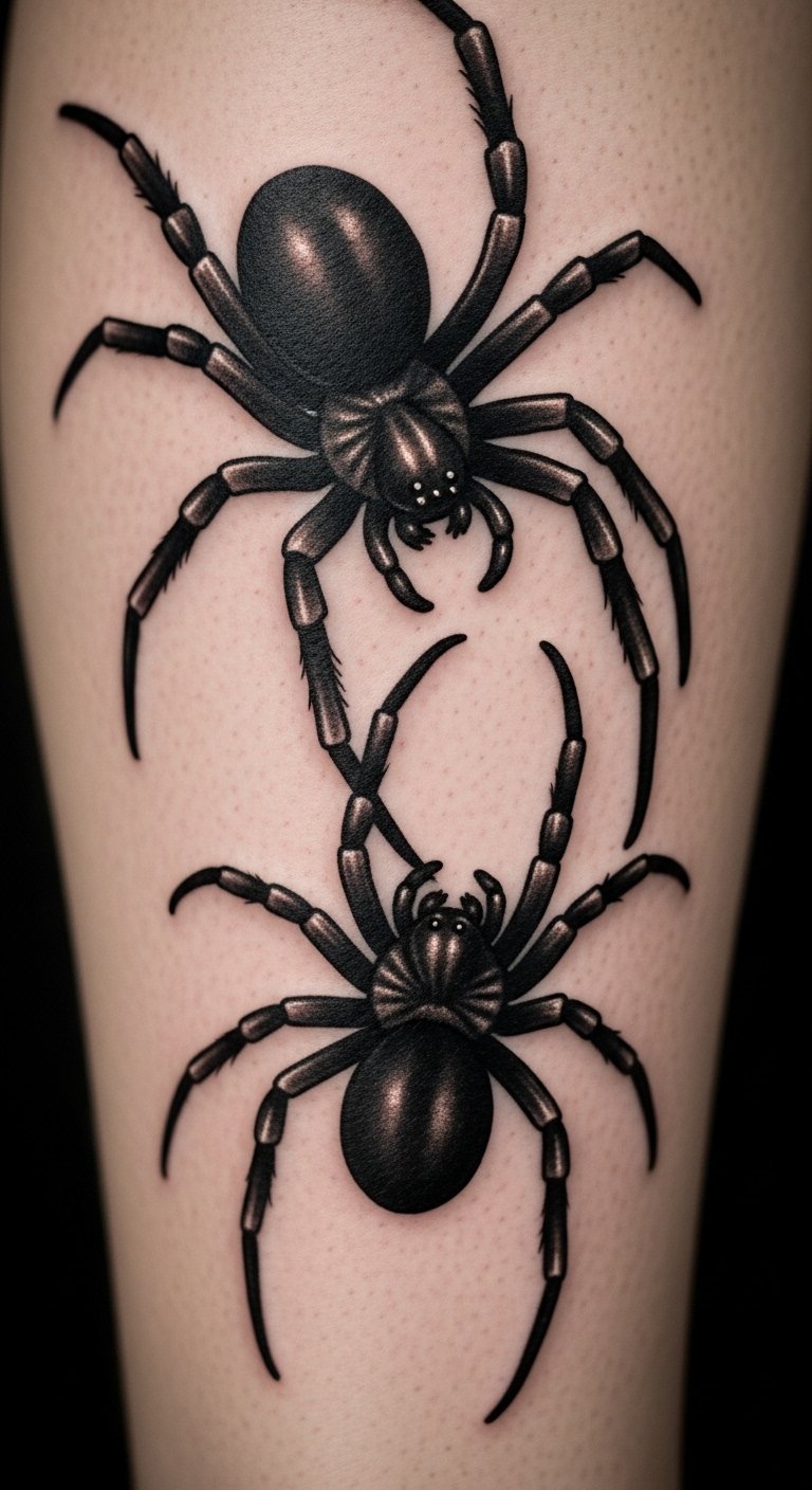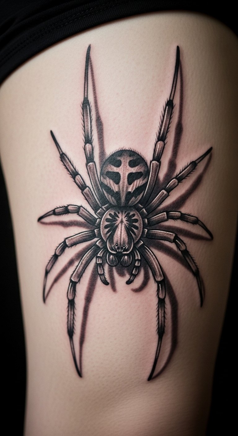Black and grey realism. Shaded spider home. Grey markers. Thigh placement. About $90. Shade layers. This design looks real. Build slowly. It’s detailed. Practice shading. You’ll see the depth.