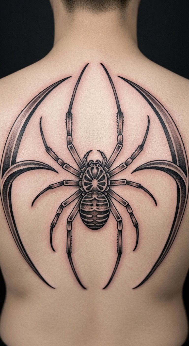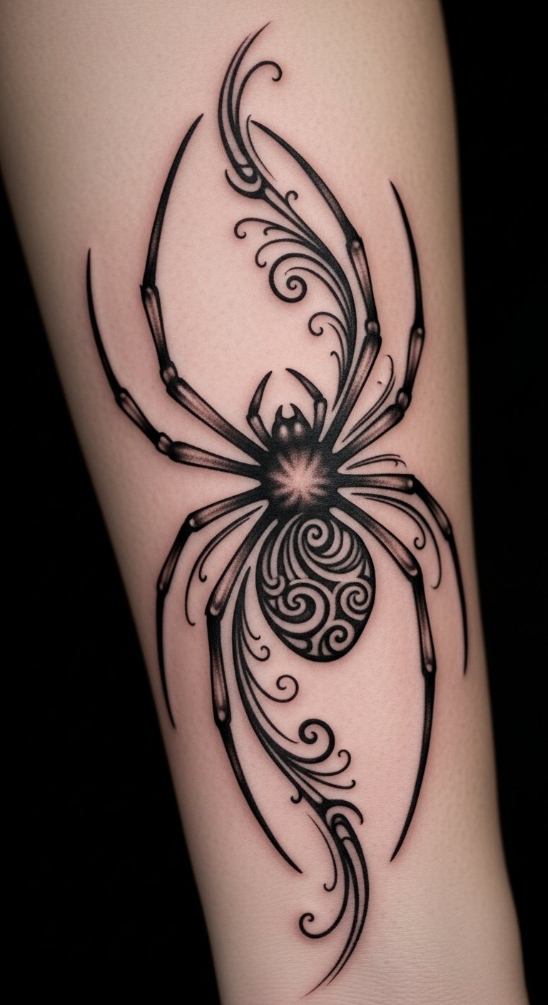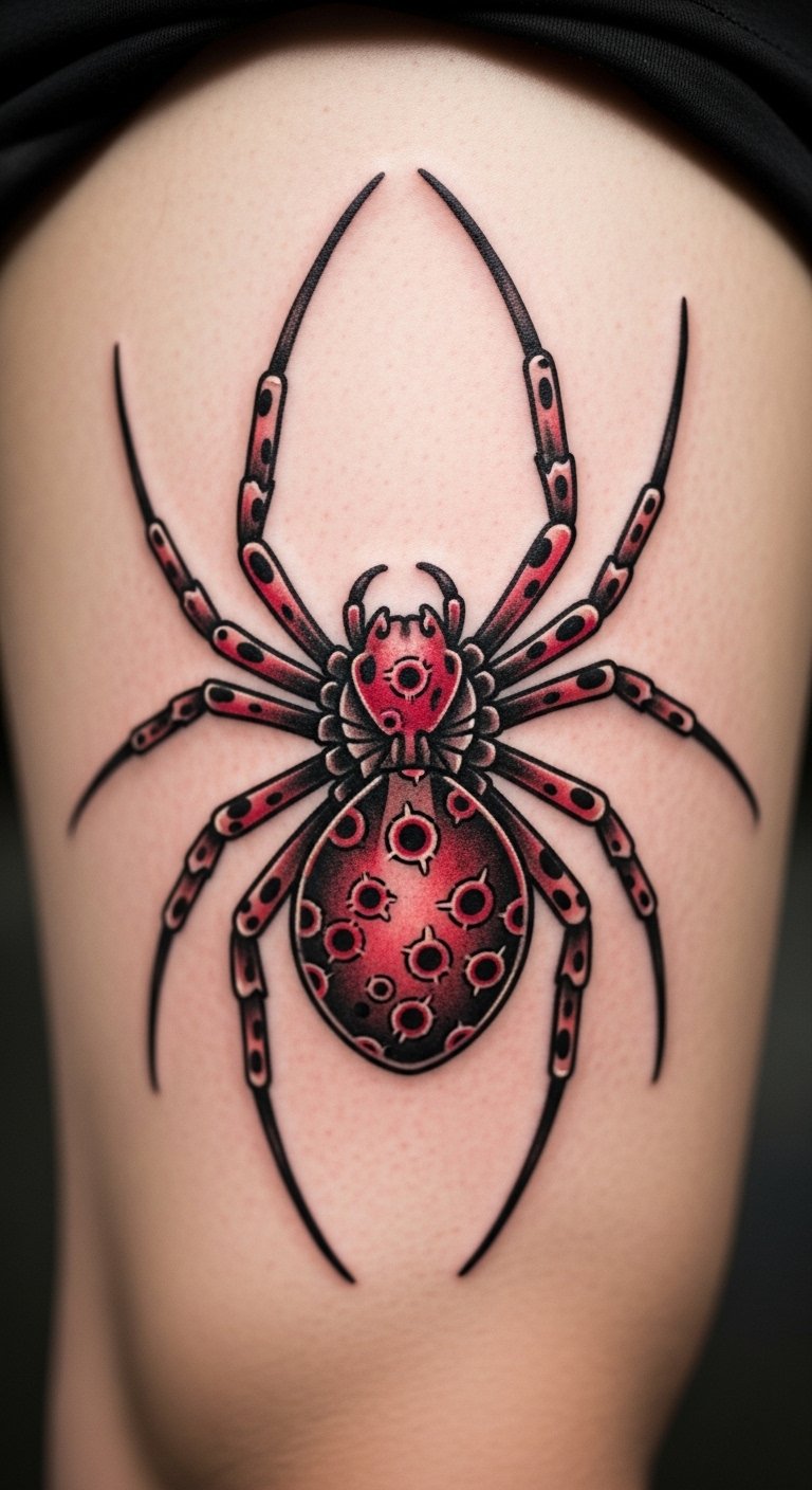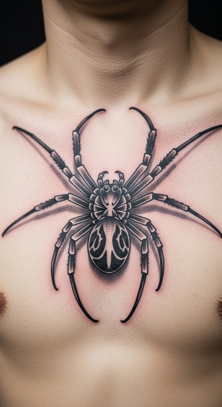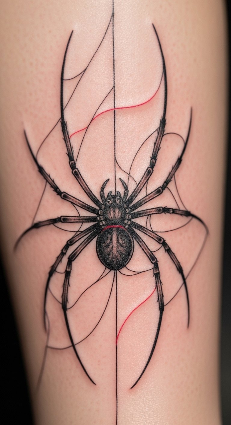 Black and grey realism. Shaded spider home. Grey markers. Thigh placement. About $90. Shade layers. This design looks real. Build slowly. It’s detailed. Practice shading. You’ll see the depth.