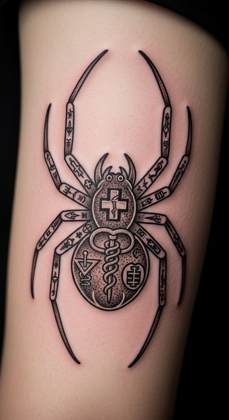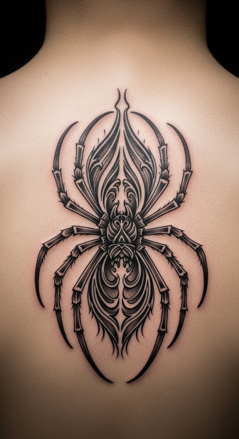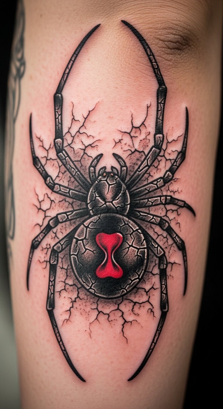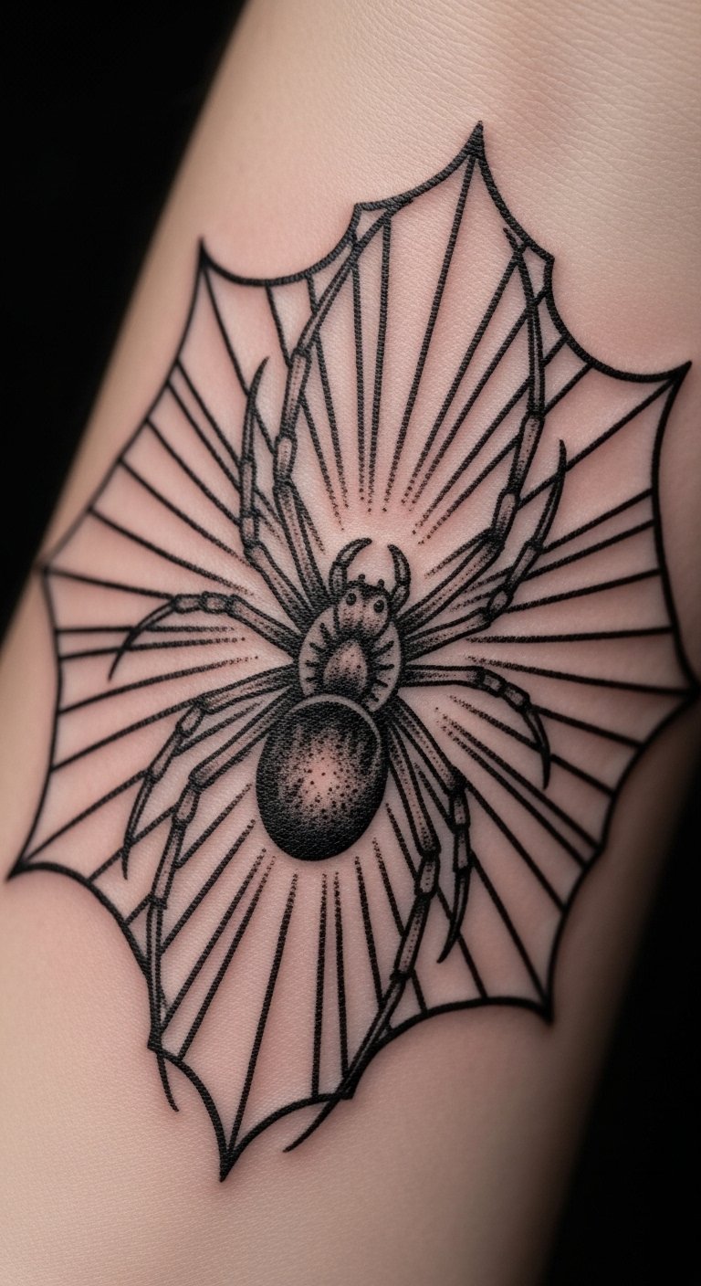 Black and grey realism. Shaded spider home. Grey markers. Thigh placement. About $90. Shade layers. This design looks real. Build slowly. It’s detailed. Practice shading. You’ll see the depth.