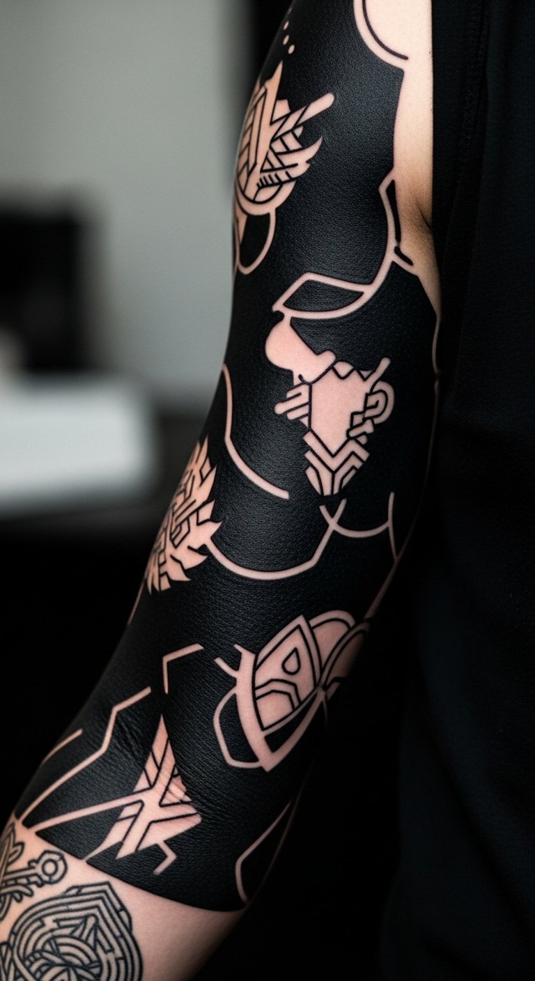 Blackout tattoos use dark ink with pops of design. They make statements. Shade with markers at home first. Black temporary ink works for trials. Choose your bicep for impact. Blackout technique stands out. Add a light detail. Look for cover-up specials. This refreshes old ink affordably. Try a small area.