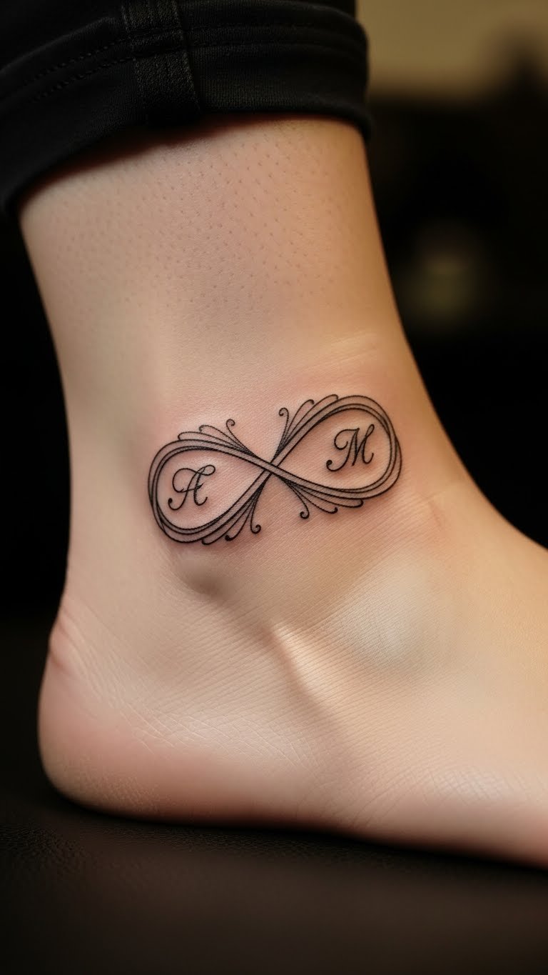 Add initials to your infinity for a personal edge. This idea mixes letters into the loop. Choose spots like your ankle for a discreet vibe. Draw it freehand at home to experiment. Grab affordable markers from any store to trace on your arm. Opt for thin lines to keep it simple. Many artists charge less for text elements. Try a DIY version with temporary tattoos online. They cost pennies and wash off easy. Focus on one or two letters to avoid clutter. Book a session during sales at local shops. Real example: Use a phone app to overlay designs on photos of yourself. This helps visualize the fit. Keep ink basic to cut expenses. Friends often share tips on affordable parlors. At the core, this design highlights forever connections.