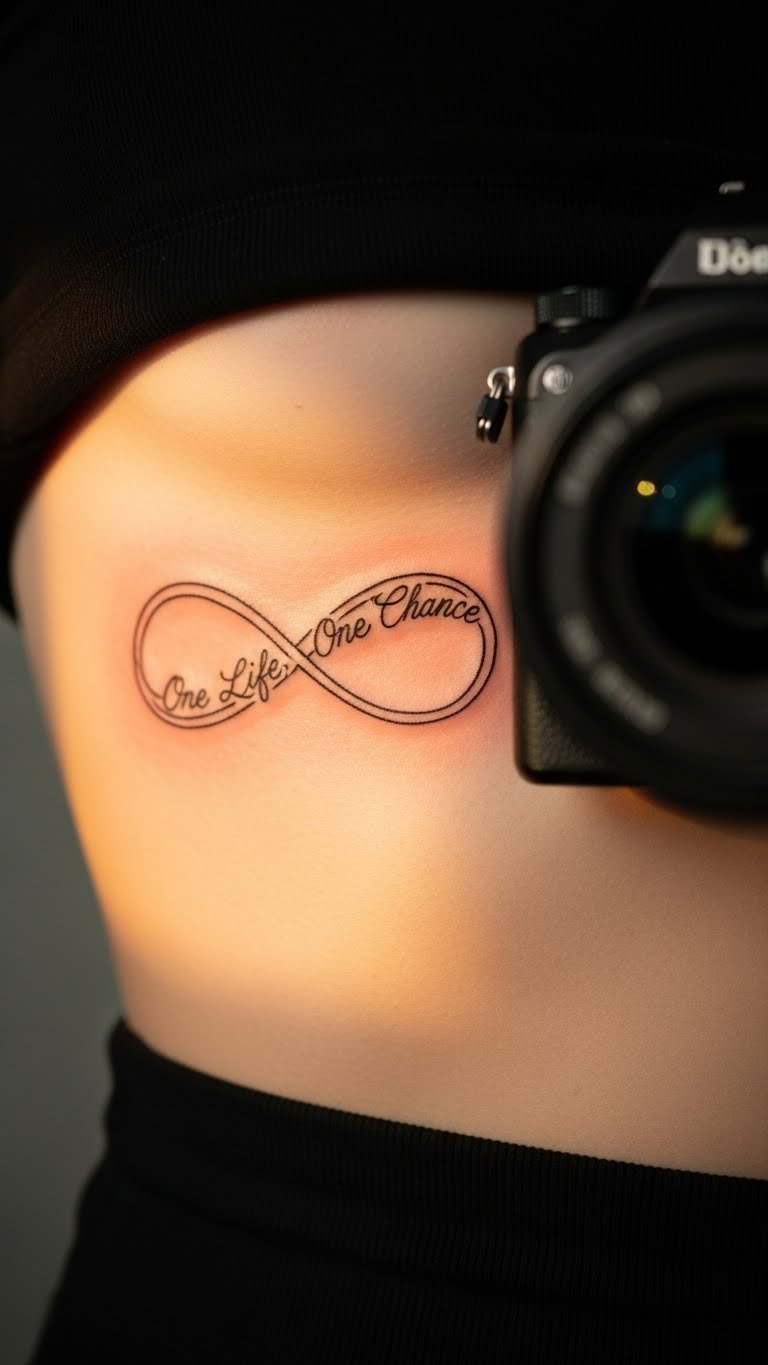Infuse a short quote into your infinity for words of wisdom. This weaves text through the loop. Place it on your ribcage for privacy. Write quotes on paper to test flow. Use free fonts from the web for ideas. Keep quotes to a word or two for savings. Some parlors add script cheaply. Temporary option: Write with eyeliner on your body. It wipes off fast. Real example: Pick a phrase like “forever” and loop it in. This keeps things meaningful without fuss. Shop around for deals on text tattoos. In the end, it ties words to the symbol perfectly.