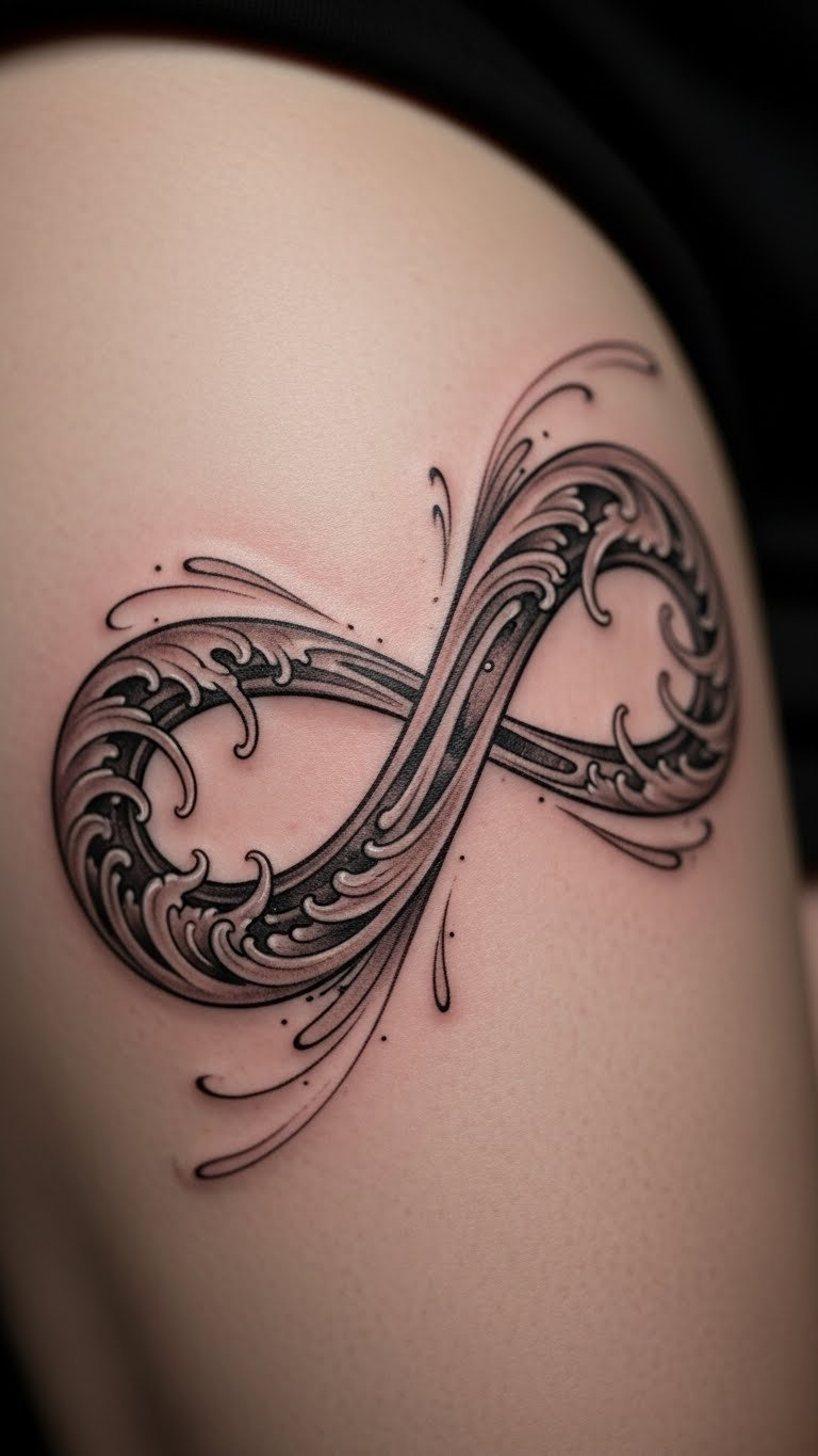 Flow waves through your infinity for an ocean feel. This adds wave lines to the loops. Choose your thigh for a dynamic spot. Sketch waves freehand at a desk. Seaside drawings online provide ideas. Keep waves minimal to save money. Look for wave-themed specials at shops. DIY: Use string to mimic waves on your arm temporarily. It’s easy and cost-free. For example, curve lines like real waves. This design evokes endless adventures.