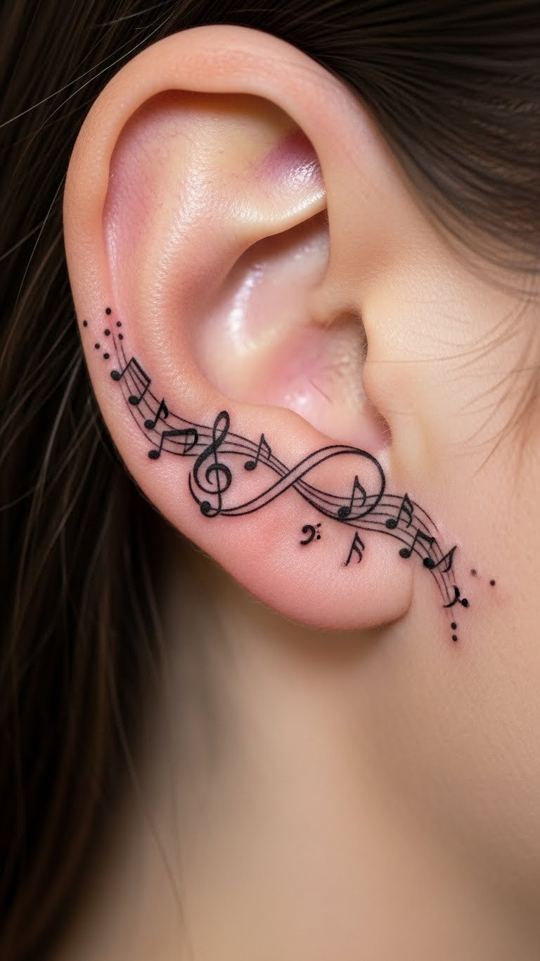 Attach music notes to your infinity for a melodic vibe. This places notes along the design. Put it near your ear for relevance. Draw notes on music paper at home. Free apps offer note templates. Limit to a couple notes for affordability. Artists may bundle music elements. Temporary idea: Tape note cutouts on your skin. They remove without hassle. Real example: Link a note to each loop end. This celebrates passions through ink.