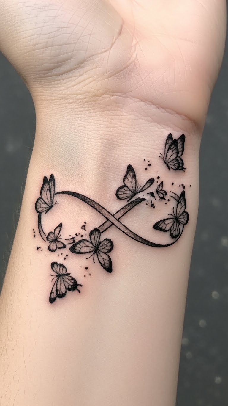 Let butterflies emerge from your infinity for transformation. This adds wing shapes to the edges. Wear it on your wrist for daily view. Trace butterflies from books at home. Simple patterns keep costs low. Shops often add wings in sets. DIY: Fold paper butterflies and pin temporarily. It’s creative and cheap. For instance, place one on each side. This design symbolizes change and love.