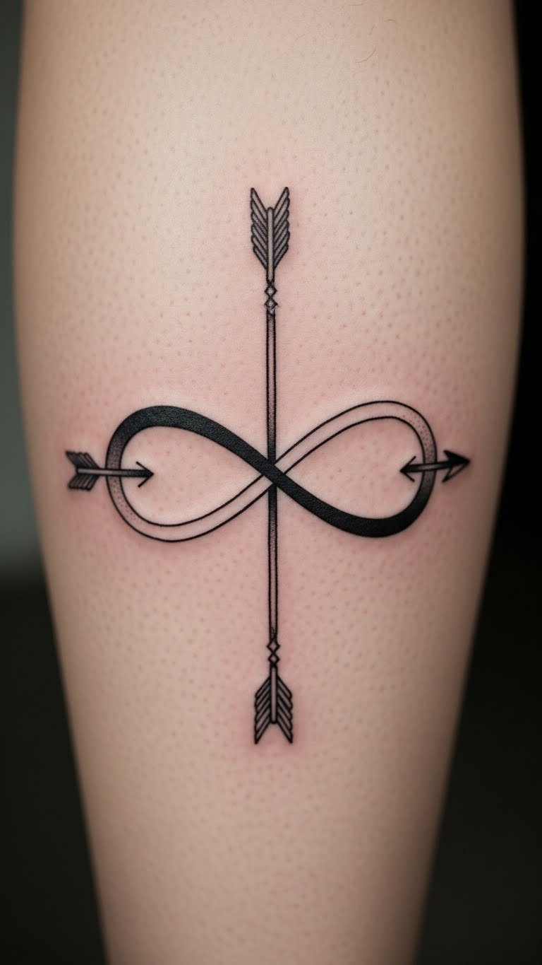 Pierce an arrow through your infinity for direction. This adds an arrow crossing the design. Put it on your leg for stability. Draw arrows with rulers at your table. Free arrow graphics are everywhere. One arrow keeps it affordable. Studios offer direction-themed deals. Temporary method: Use straws to mimic arrows on skin. Quick and reusable. Real tip: Angle the arrow through the center. This shows forward-moving love.