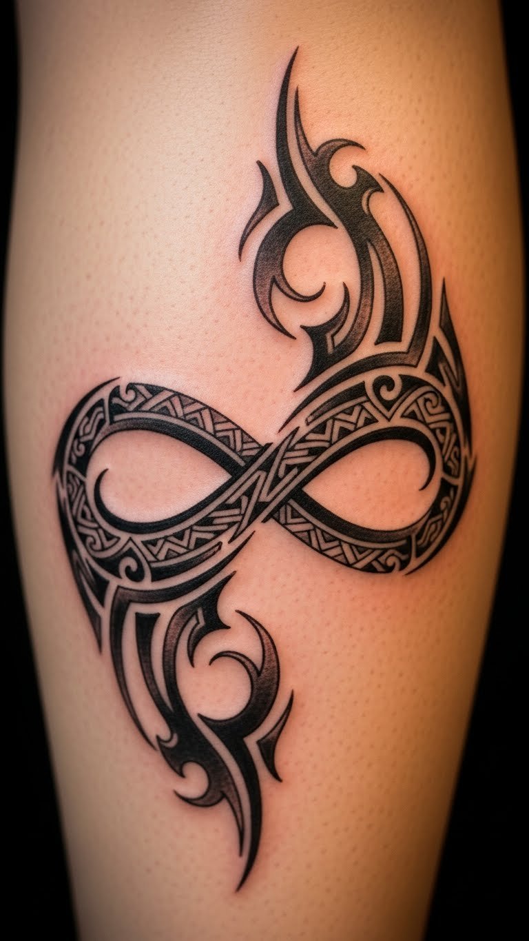 Edge your infinity with tribal patterns for culture. This adds tribal lines to the borders. Place it on your leg for strength. Draw tribal art from references. Online tribal designs are accessible. Use basic patterns for savings. Studios have cultural options. Temporary method: Trace with henna for a trial. Natural and low-cost. Real tip: Make patterns frame the loop. This design honors traditions in ink.