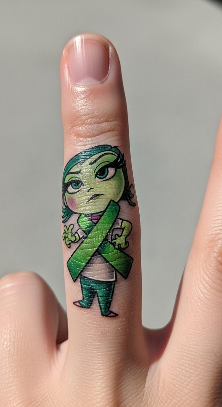 Try a green ribbon for Disgust vibes. This design highlights awareness with a ribbon twist. Place it on a finger for visibility. Draw ribbons on your hand with pens to try. Find free design tools on your phone. Pick an artist who does small jobs cheaply. Add leaves for a fun element. Practice with stick-on versions first. Stick to one color for savings. Get it done fast. Use as a health reminder. Cover during chores. Make it no bigger than a coin. Heal with simple creams. Post on social apps. Let it stand for your boundaries.