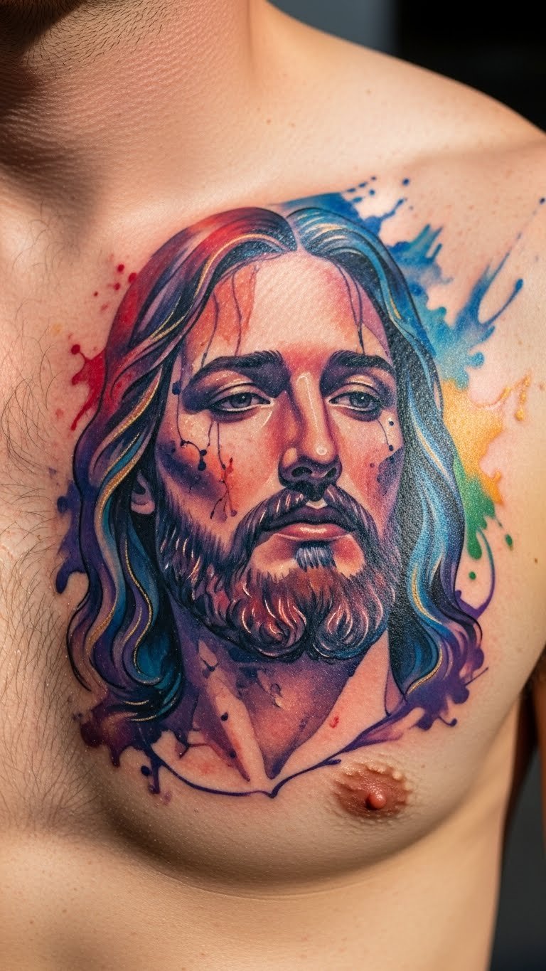 A watercolor Jesus portrait brings art to life with flowing colors and gentle blends. It looks modern and uplifting, like a painting on your skin. Break it down: pick soft blues and reds for a heavenly feel. Try a DIY approach by coloring simple sketches with markers to preview the design. Budget-friendly? Look for artists offering sessions for less than $150 or practice with washable inks on paper. Keep it practical by choosing a spot that hides easily. This tattoo acts as a personal lift during tough days. Add your twist, like a small flower, to make it unique without extra cost.