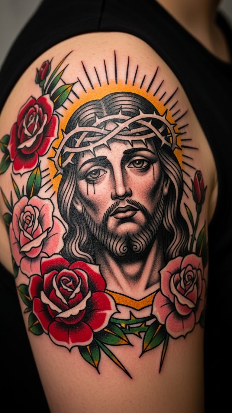 A traditional Jesus with roses mixes bold lines and flowers for timeless appeal. Roses symbolize love and faith, wrapping around Jesus for added depth. Draw basic shapes with markers as a fun DIY project. Find budget artists offering this style for about $100, or practice with freehand drawings. Bold the roses to highlight their meaning. Choose your shoulder for easy cover-up. This tattoo stands as a strong identity marker, and you can adapt it by adding petals from online templates.