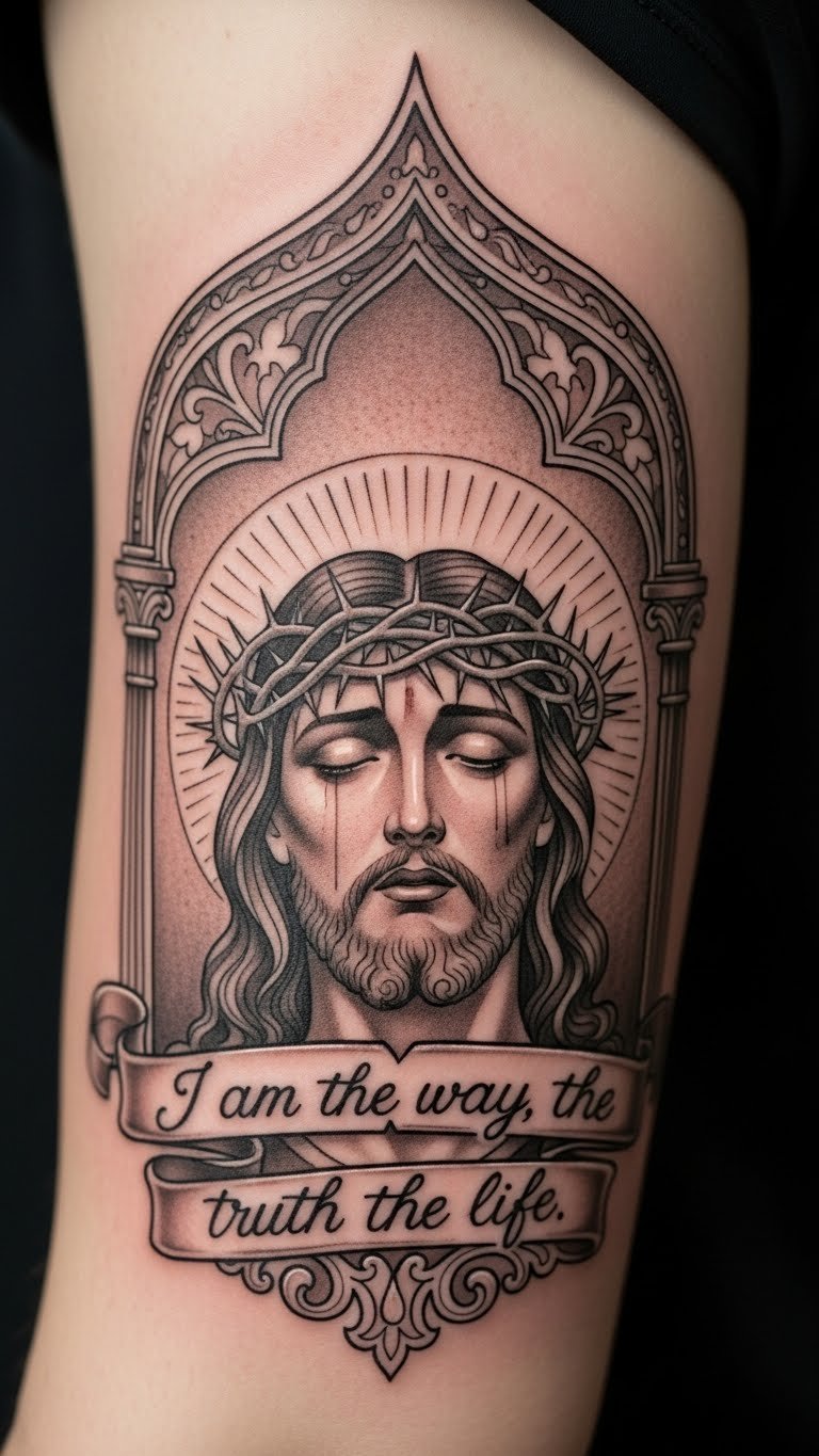 A Bible quote in Jesus frame encircles words with his image for added meaning. Choose impactful quotes for your story. Write quotes in frames on paper first. Budget artists might charge $90, or use apps for layouts. Bold the quote to stand out. Put it on your arm for daily views. This tattoo tells your journey, customizable simply.