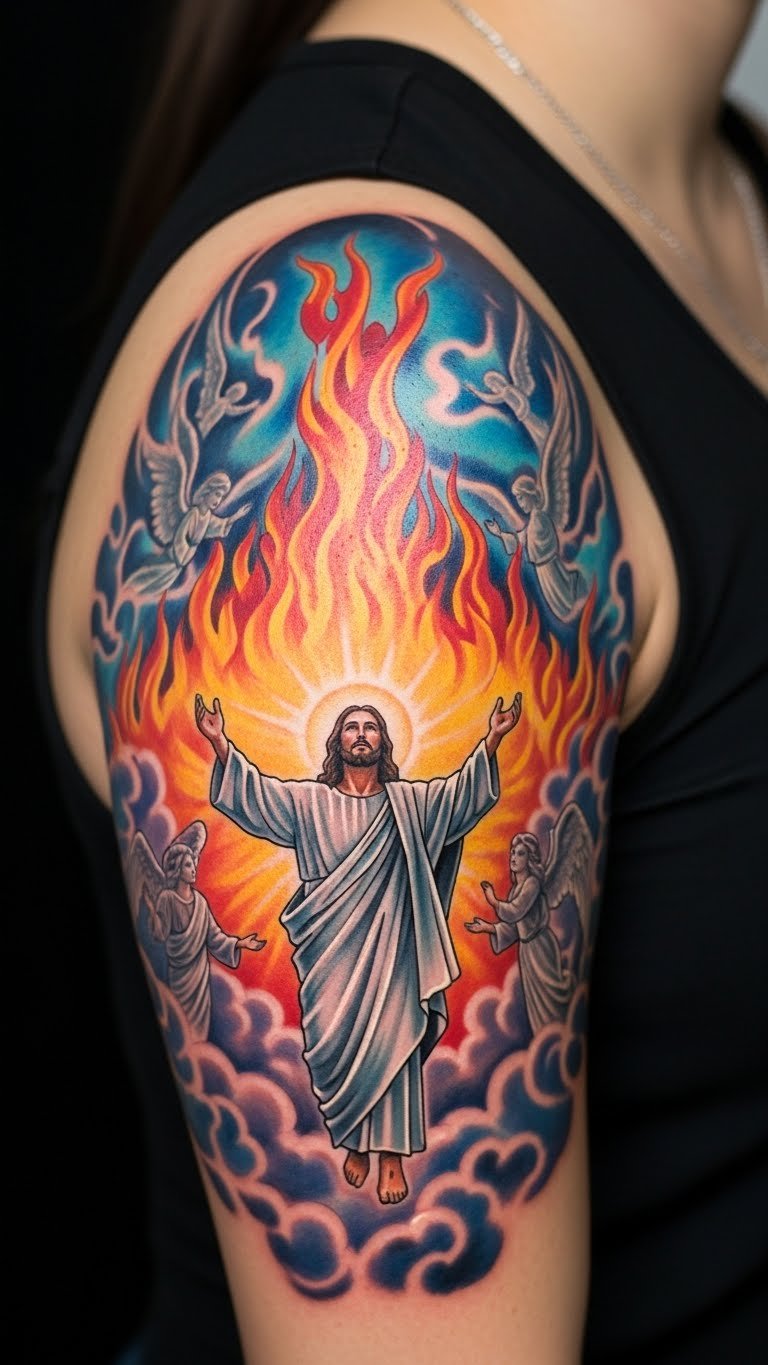 A colorful ascension tattoo shows Jesus rising with vibrant hues. It lifts spirits with every color. Blend colors on paper for ideas. Seek shoulder deals at $120. This design motivates, customizable with shades.