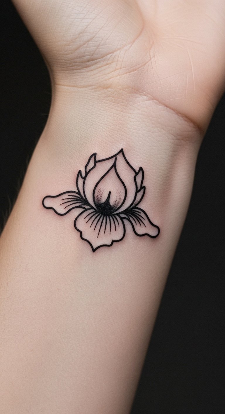 A minimalist wrist iris keeps things straightforward. Picture a small flower outline in black ink. This design fits daily life without drawing too much notice. Start with a basic sketch on paper to test the look. Find an artist online for under $50 if you shop around local spots. Try drawing it yourself with a pen for practice. Keep ink simple to save money. Bold colors are not needed here. Go for a session that takes less than an hour. This option works for first-timers. Add a band-aid after to protect it. Check your skin reaction before going pro.
